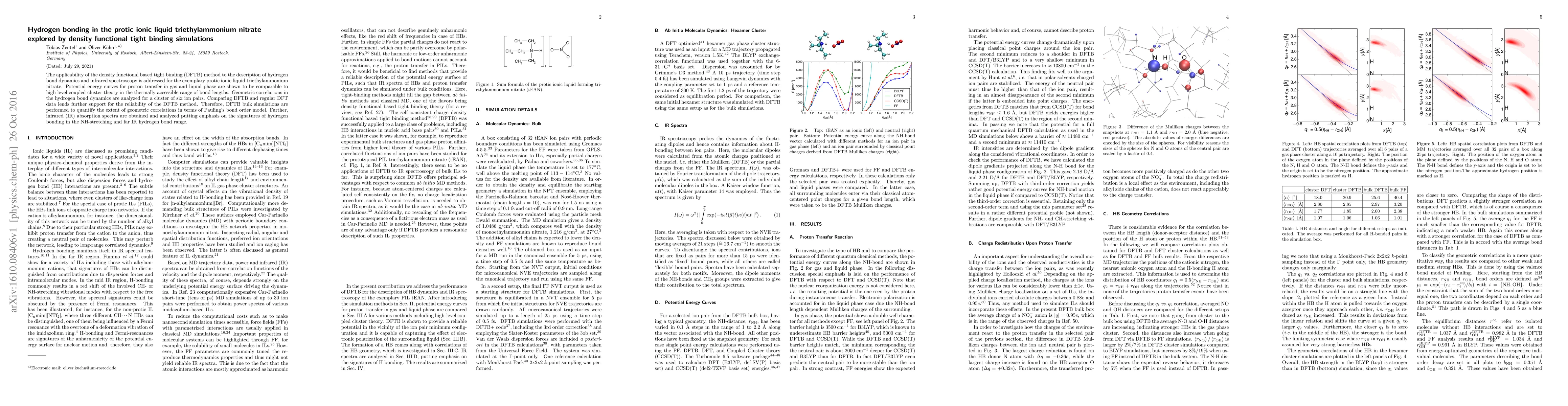 This paper explores the hydrogen bonding in triethylammonium nitrate using density functional tight binding (DFTB) simulations, demonstrating the method's reliability by comparing it to high-level coupled cluster theory and regular DFT data. The study also analyzes geometric correlations and infrared absorption spectra to understand hydrogen bond dynamics.
