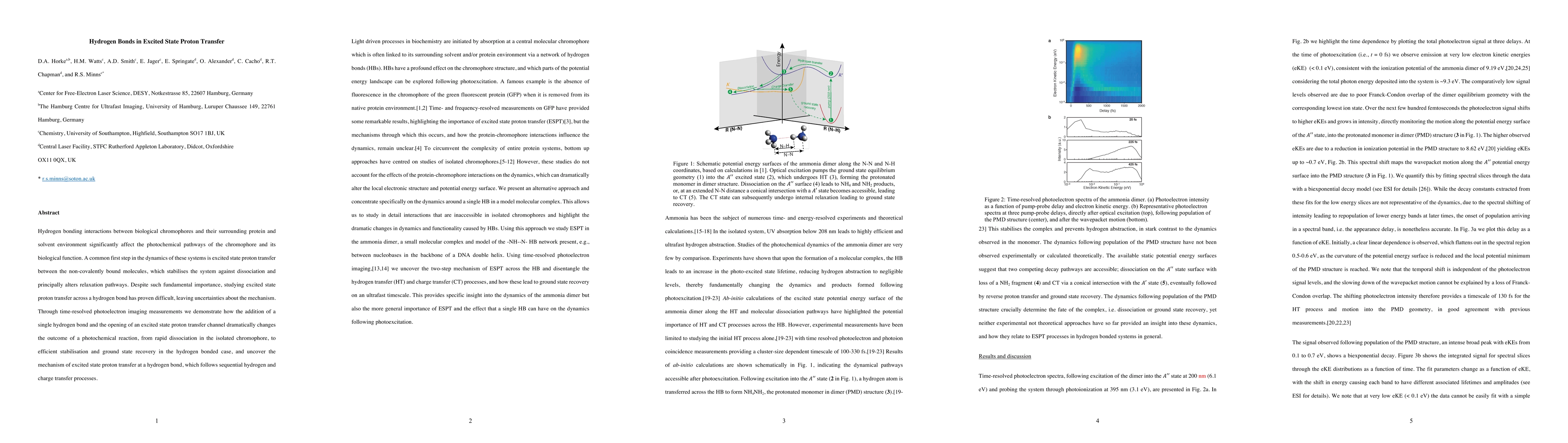 This paper investigates how hydrogen bonding influences excited state proton transfer in biological chromophores, revealing that a single hydrogen bond can drastically change the photochemical reaction from dissociation to stabilisation, and elucidates the mechanism as sequential hydrogen and charge transfer processes.