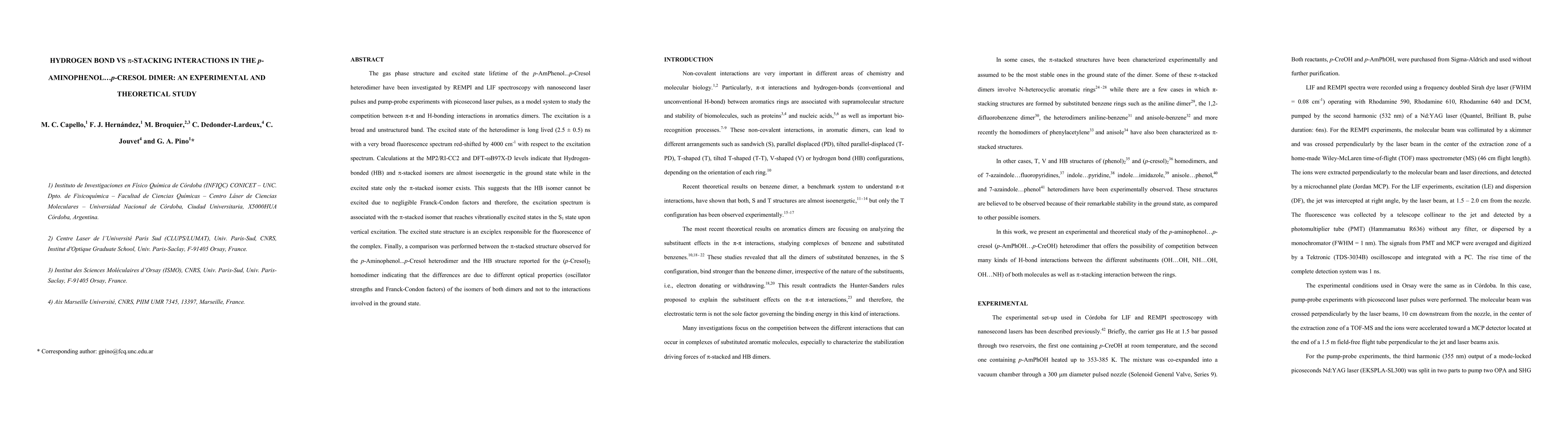 The gas phase structure and excited state lifetime of the p-aminophenol...p-cresol heterodimer have been investigated by REMPI and LIF spectroscopy with nanosecond laser pulses and pump-probe experiments with picosecond laser pulses as a model system to study the competition between p-p and H-bonding interactions in aromatic dimers. The excitation is a broad and unstructured band. The excitedstate of the heterodimer is long lived (2.5 +/- 0.5) ns with a very broad fluorescence spectrum red-shifted by 4000 cm^{-1} with respect to the excitation spectrum. Calculations at the MP2/RI-CC2 and DFT-oB97X-D levels indicate that hydrogen-bonded (HB) and p-stacked isomers are almost isoenergetic in the ground state while in the excited state only the p-stacked isomer exists. This suggests that the HB isomer cannot be excited due to negligible Franck-Condon factors and therefore the excitation spectrum is associated with the p-stacked isomer that reaches vibrationally excited states in the S1 state upon vertical excitation. The excited state structure is an exciplex responsible for the fluorescence of the complex. Finally,a comparison was performed between the p-stacked structure observed for the p-aminophenol...p-cresol heterodimer and the HB structure reported for the (p-cresol)2 homodimer indicating that the differences are due to different optical properties (oscillator strengths and Franck-Condon factors) of the isomers of both dimers and not to the interactions involved in the ground state