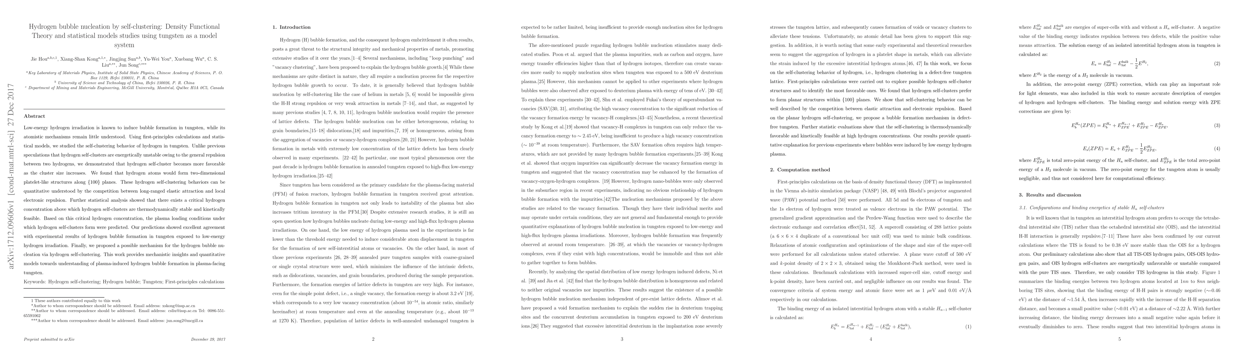 Low-energy hydrogen irradiation is known to induce bubble formation in tungsten, while its atomistic mechanisms remain little understood. Using first-principles calculations and statistical models, we studied the self-clustering behavior of hydrogen in tungsten. Unlike previous speculations that hydrogen self-clusters are energetically unstable owing to the general repulsion between two hydrogens, we demonstrated that hydrogen self-cluster becomes more favorable as the cluster size increases. We found that hydrogen atoms would form two-dimensional platelet-like structures along {100} planes. These hydrogen self-clustering behaviors can be quantitative understood by the competition between long-ranged elastic attraction and local electronic repulsion. Further statistical analysis showed that there exists a critical hydrogen concentration above which hydrogen self-clusters are thermodynamically stable and kinetically feasible. Based on this critical hydrogen concentration, the plasma loading conditions under which hydrogen self-clusters form were predicted. Our predictions showed excellent agreement with experimental results of hydrogen bubble formation in tungsten exposed to low-energy hydrogen irradiation. Finally, we proposed a possible mechanism for the hydrogen bubble nucleation via hydrogen self-clustering. This work provides mechanistic insights and quantitative models towards understanding of plasma-induced hydrogen bubble formation in plasma-facing tungsten.