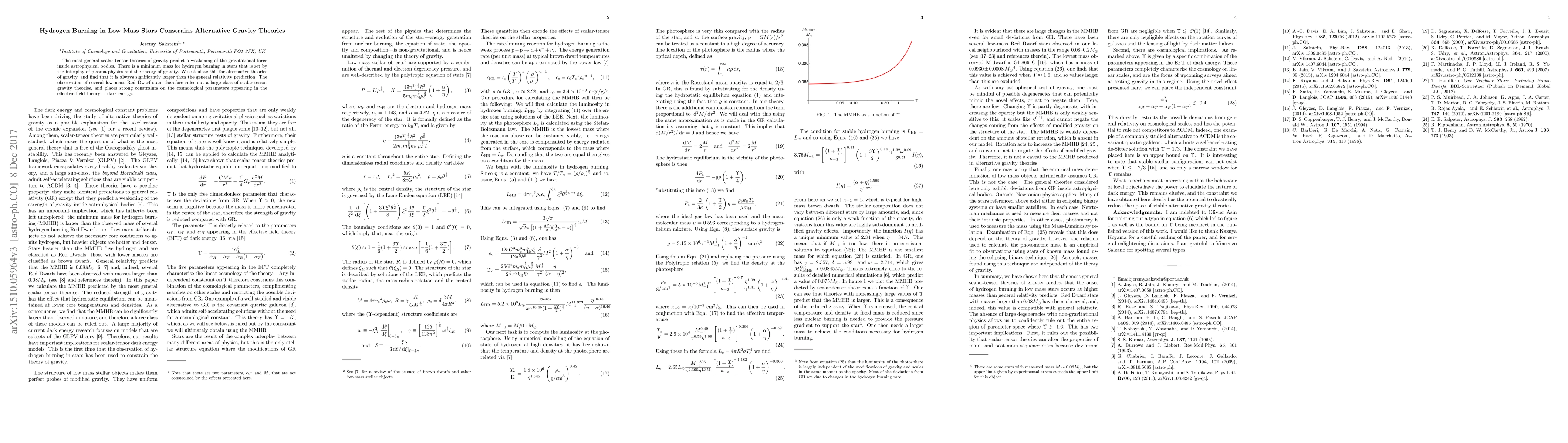 The study finds that alternative gravity theories predict a lower minimum mass for hydrogen burning in stars than observed, ruling out several classes of scalar-tensor theories.