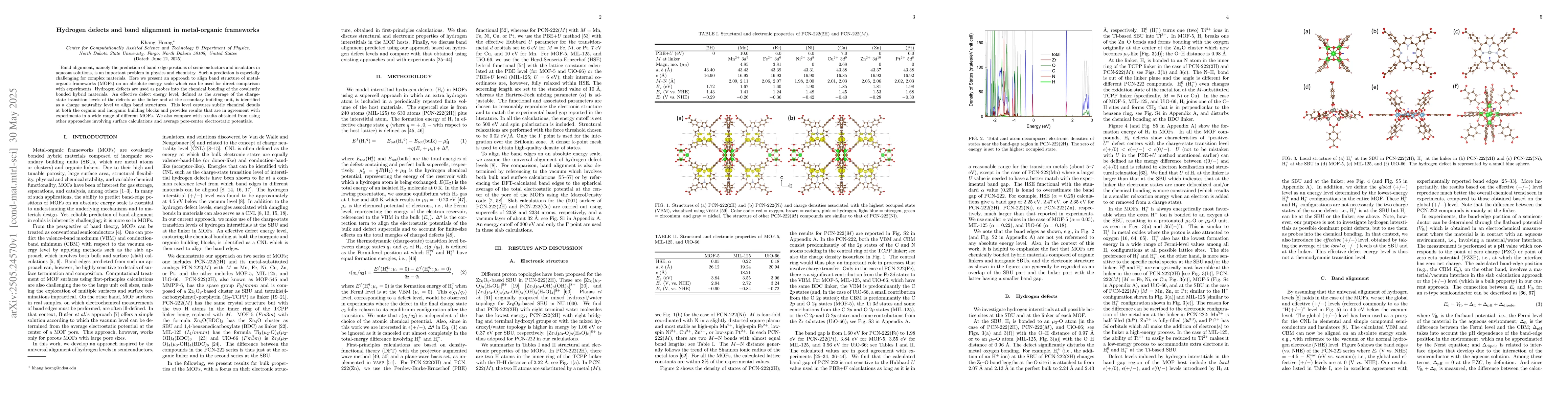 The research presents an approach to align band structure of metal-organic frameworks (MOFs) on an absolute energy scale using hydrogen defects as probes into chemical bonding, defining an effective defect energy level as a charge neutrality level for alignment.