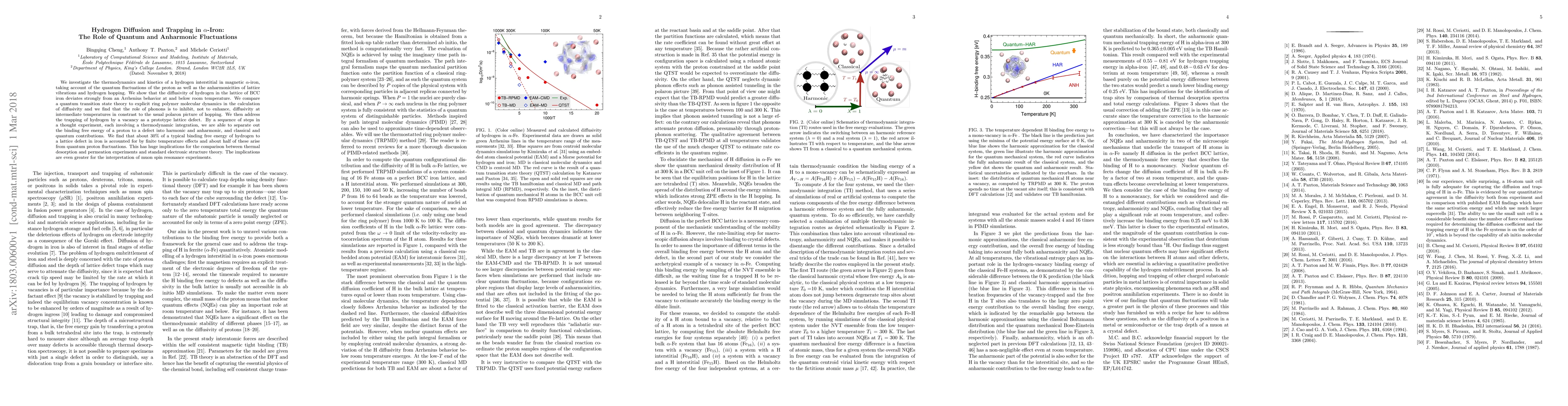 This paper explores the thermodynamics and kinetics of hydrogen diffusion and trapping in α-iron, emphasizing the effects of quantum fluctuations and anharmonic lattice vibrations. It reveals that hydrogen diffusivity in BCC iron deviates from Arrhenius behavior due to phonon inhibition, contrary to the polaron model, and quantifies the contributions of quantum and anharmonic effects to hydrogen binding to defects.