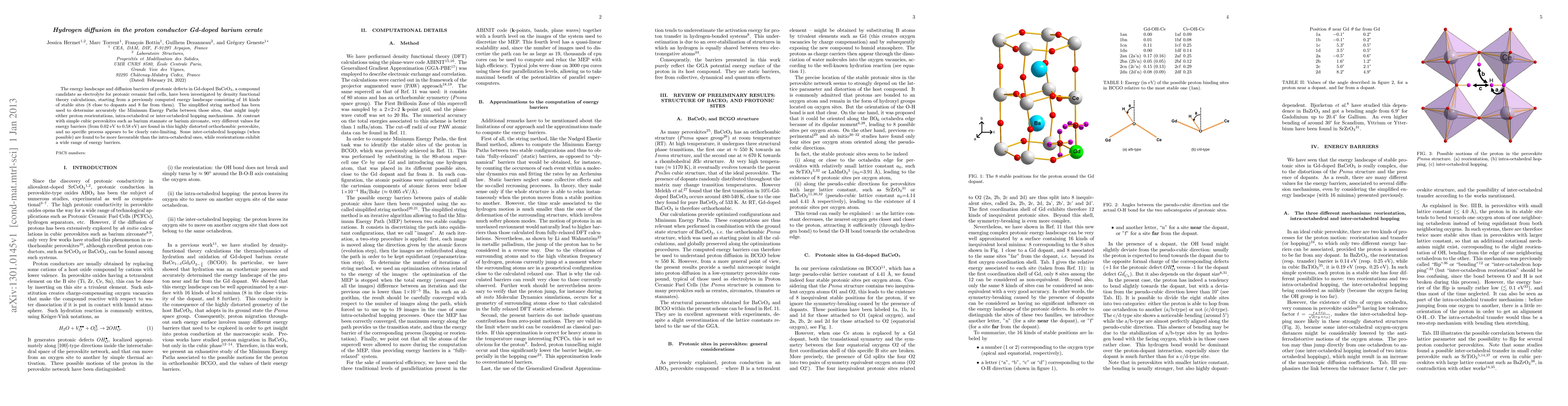 This paper investigates hydrogen diffusion in Gd-doped BaCeO3 using density functional theory, revealing diverse energy barriers (0.02 eV to 0.58 eV) for various protonic defect pathways, with no single process dominating as rate-limiting. Inter-octahedral hops are often more favorable than intra-octahedral ones.