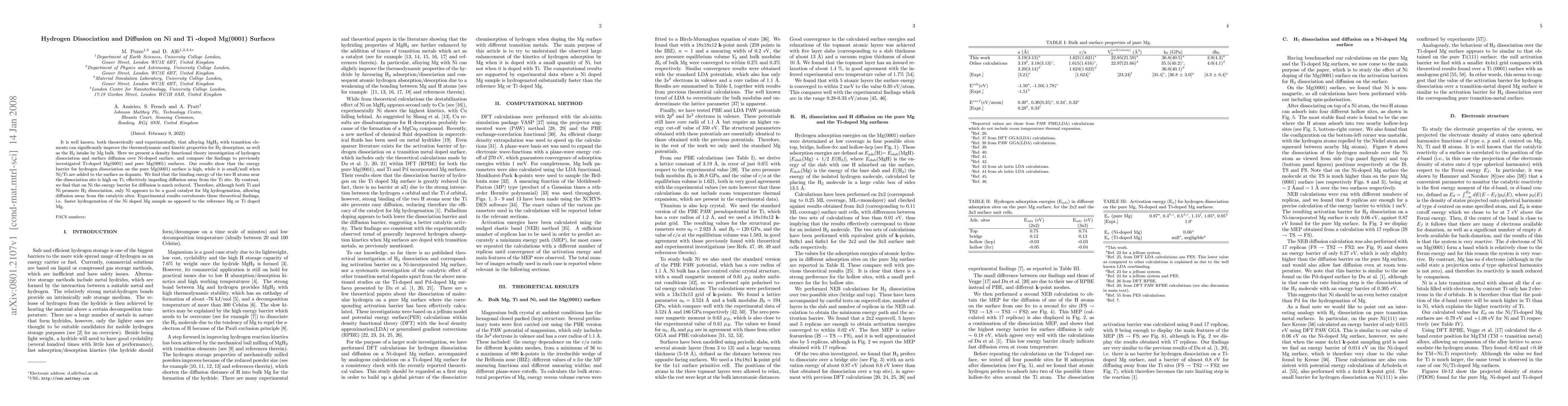 This study investigates hydrogen dissociation and diffusion on Ni-doped and Ti-doped Mg(0001) surfaces using density functional theory, finding that Ni effectively reduces energy barriers for diffusion, unlike Ti, which impedes diffusion despite promoting dissociation. Experimental corroboration shows faster hydrogenation in Ni-doped Mg samples.