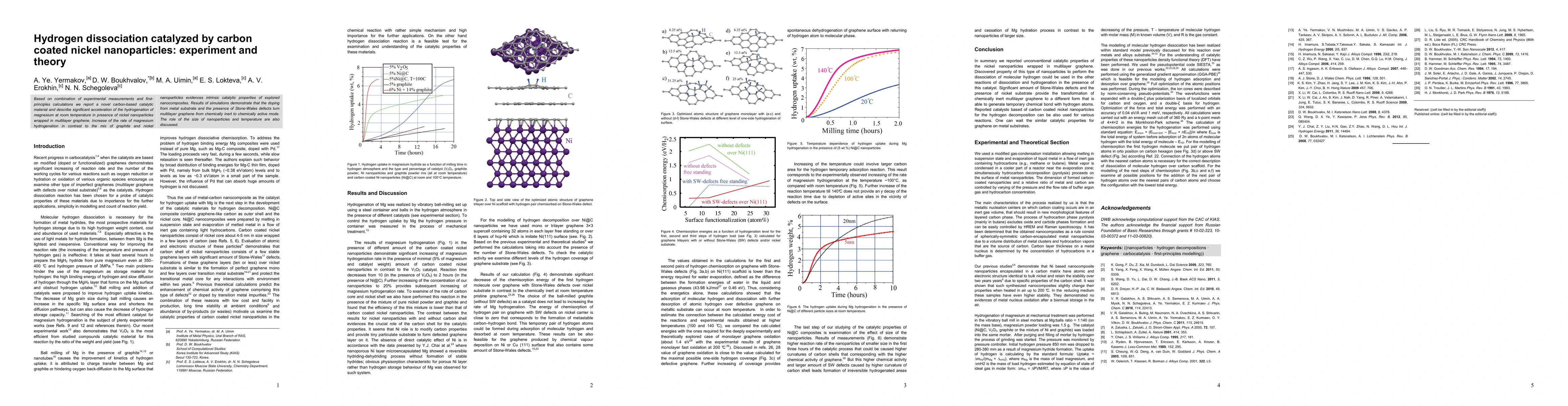This paper combines experimental and theoretical studies to reveal that carbon-coated nickel nanoparticles significantly accelerate magnesium hydrogenation at room temperature. The enhanced catalytic activity is attributed to the intrinsic properties of the nanocomposites, with simulations showing that graphene becomes chemically active due to metal doping and Stone-Wales defects.
