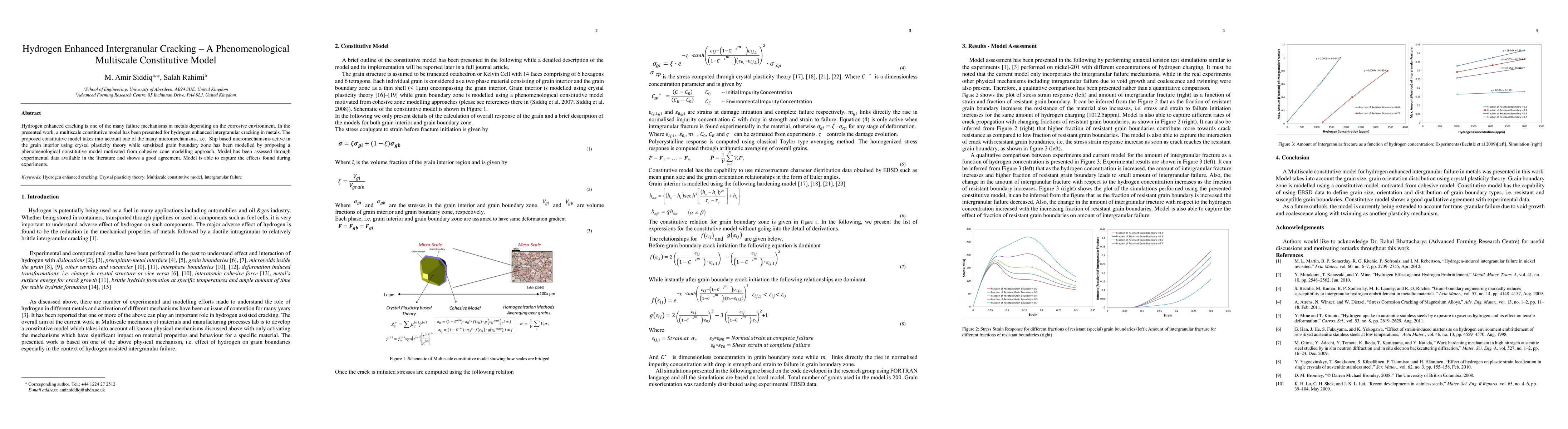 Hydrogen enhanced cracking is one of the many failure mechanisms in metals depending on the corrosive environment. In the presented work, a multiscale constitutive model has been presented for hydrogen enhanced intergranular cracking in metals. The proposed constitutive model takes into account one of the many micromechanisms, i.e. Slip based micromechanisms active in the grain interior using crystal plasticity theory while sensitized grain boundary zone has been modelled by proposing a phenomenological constitutive model motivated from cohesive zone modelling approach. Model has been assessed through experimental data available in the literature and shows a good agreement. Model is able to capture the effects found during experiments.