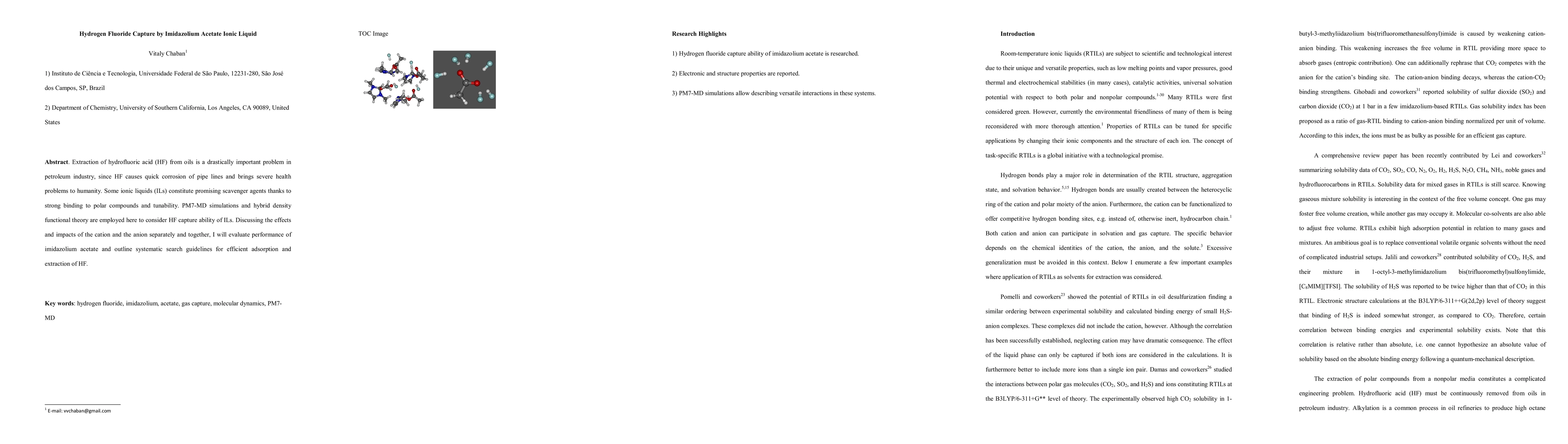 Extraction of hydrofluoric acid (HF) from oils is a drastically important problem in petroleum industry, since HF causes quick corrosion of pipe lines and brings severe health problems to humanity. Some ionic liquids (ILs) constitute promising scavenger agents thanks to strong binding to polar compounds and tunability. PM7-MD simulations and hybrid density functional theory are employed here to consider HF capture ability of ILs. Discussing the effects and impacts of the cation and the anion separately and together, I will evaluate performance of imidazolium acetate and outline systematic search guidelines for efficient adsorption and extraction of HF.