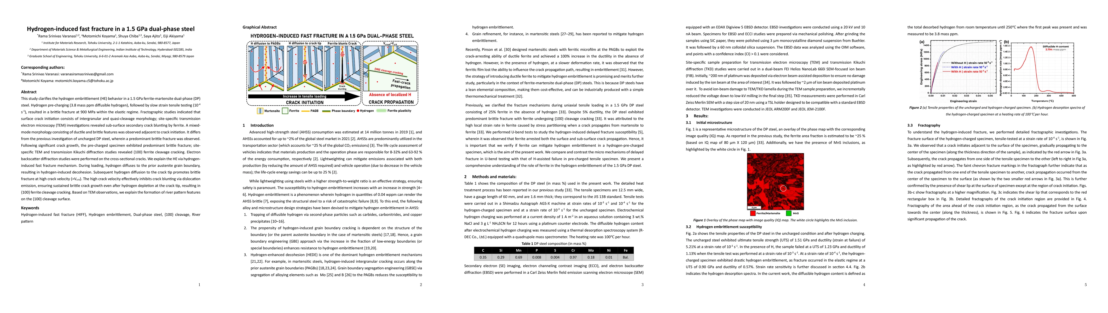 This study clarifies the hydrogen embrittlement (HE) behavior in a 1.5 GPa ferrite-martensite dual-phase (DP) steel. Hydrogen pre-charging (3.8 mass ppm diffusible hydrogen), followed by slow strain tensile testing (10-4 s-1), resulted in a brittle fracture at 900 MPa within the elastic regime. Fractographic studies indicated that surface crack initiation consists of intergranular and quasi-cleavage morphology; site-specific transmission electron microscopy (TEM) investigations revealed sub-surface secondary crack blunting by ferrite. A mixed-mode morphology consisting of ductile and brittle features was observed adjacent to crack initiation. It differs from the previous investigation of uncharged DP steel, wherein a predominant brittle fracture was observed. Following significant crack growth, the pre-charged specimen exhibited predominant brittle fracture; site-specific TEM and transmission Kikuchi diffraction studies revealed {100} ferrite cleavage cracking. Electron backscatter diffraction studies were performed on the cross-sectional cracks. We explain the HE via hydrogen-induced fast fracture mechanism. During loading, hydrogen diffuses to the prior austenite grain boundary, resulting in hydrogen-induced decohesion. Subsequent hydrogen diffusion to the crack tip promotes brittle fracture at high crack velocity (>Vcrit). The high crack velocity effectively inhibits crack blunting via dislocation emission, ensuring sustained brittle crack growth even after hydrogen depletion at the crack tip, resulting in {100} ferrite cleavage cracking. Based on TEM observations, we explain the formation of river pattern features on the {100} cleavage surface.