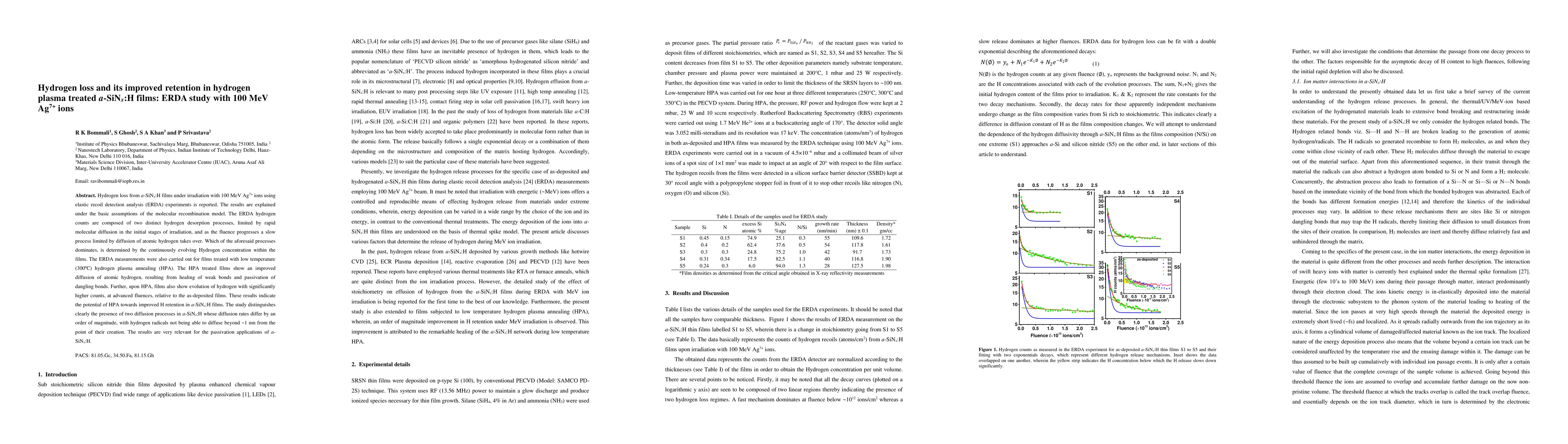 This study investigates hydrogen loss in a-SiNx:H films under 100 MeV Ag7+ ion irradiation using ERDA, identifying two distinct hydrogen desorption processes. Hydrogen plasma annealing at 300°C improves atomic hydrogen diffusion, enhancing hydrogen retention and passivation, which is crucial for a-SiNx:H applications.