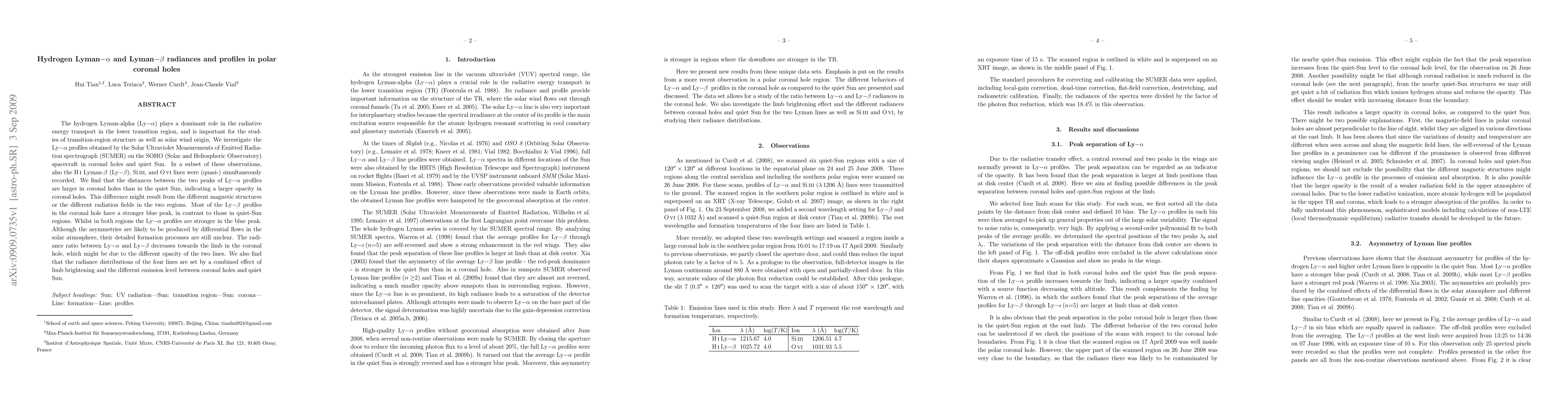 This study investigates hydrogen Lyman-alpha and Lyman-beta radiances in coronal holes and quiet Sun using SUMER data, revealing larger Ly-alpha profile distances in coronal holes due to higher opacity. The Ly-beta profiles show stronger blue peaks in coronal holes, suggesting differential flows in the solar atmosphere.