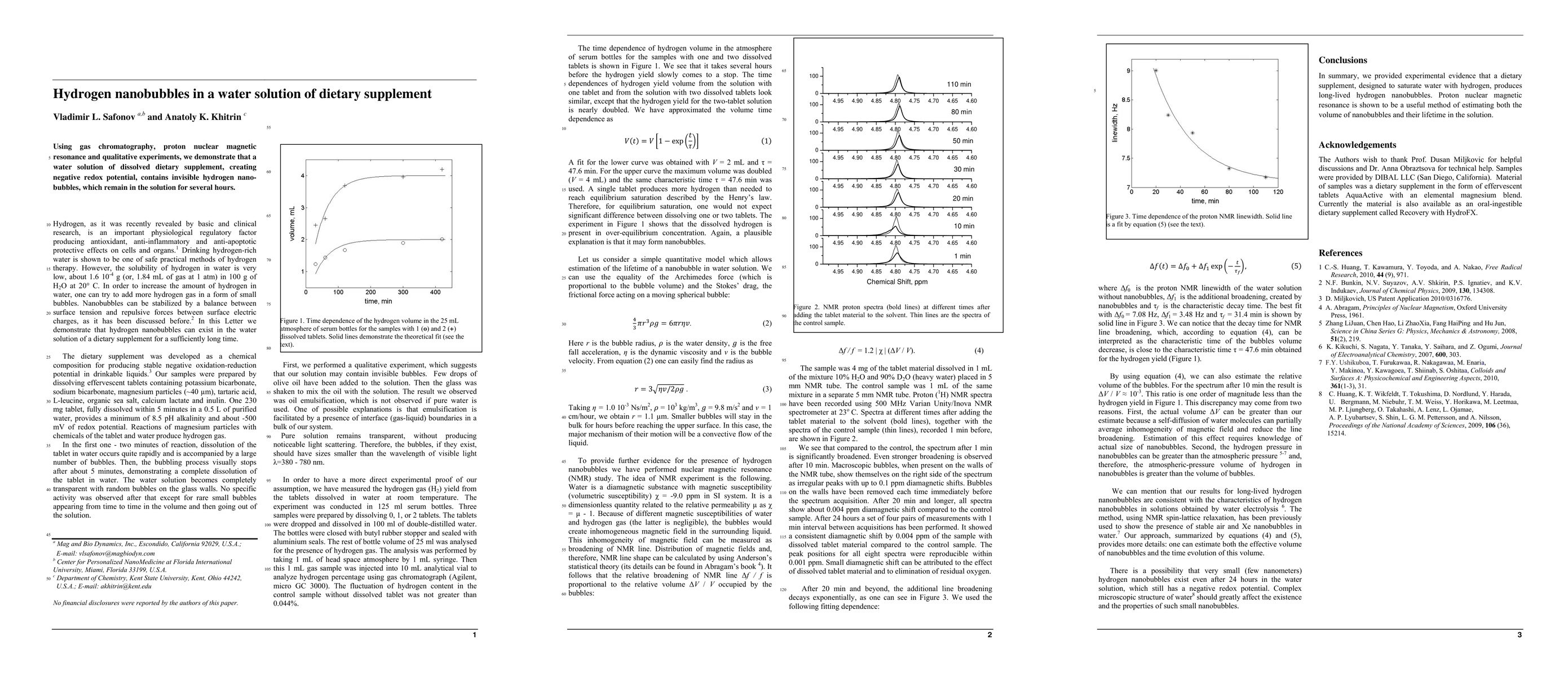 Researchers detected hydrogen nanobubbles in a water solution of dietary supplement, which remained stable for several hours using gas chromatography and NMR techniques.