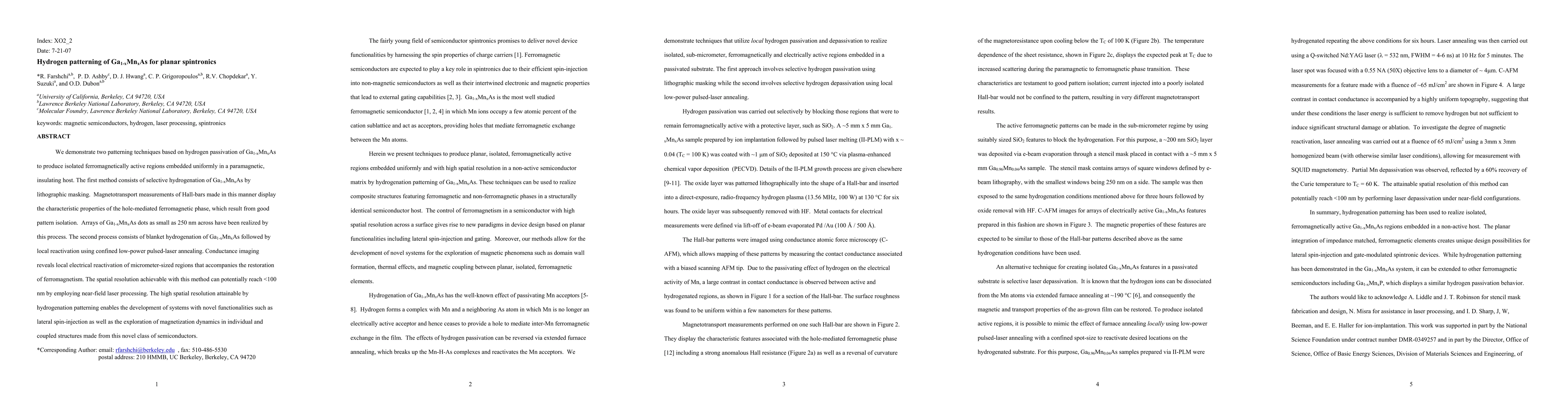 This paper presents two hydrogen passivation techniques for patterning Ga1-xMnxAs, enabling the creation of isolated ferromagnetic regions in a paramagnetic host. The methods allow for the fabrication of micrometer-sized ferromagnetic dots and potentially sub-100 nm resolution structures, paving the way for advanced spintronic applications.