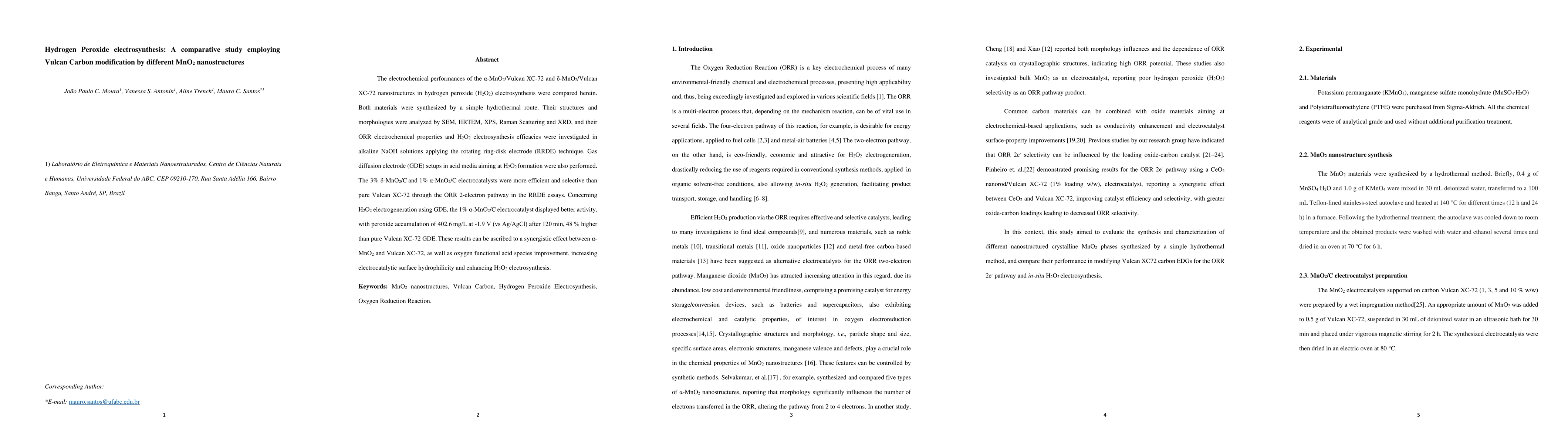 Researchers compared the electrochemical performances of two manganese dioxide nanostructures with Vulcan carbon in hydrogen peroxide electrosynthesis, finding that 1% {eta}-MnO2/C was more efficient and selective than pure Vulcan XC-72.