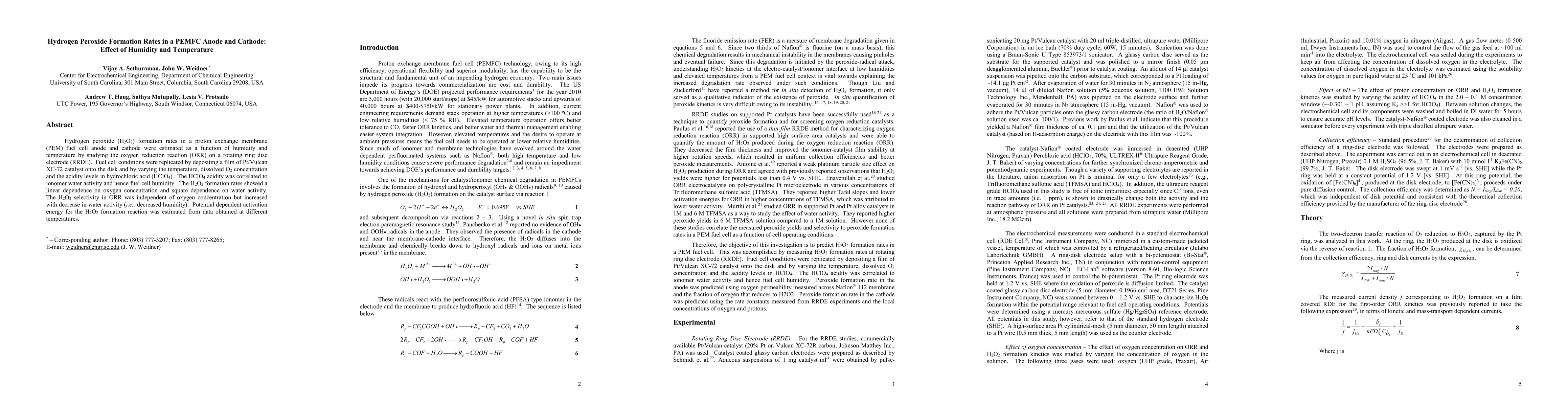 Hydrogen peroxide (H2O2) formation rates in a proton exchange membrane (PEM) fuel cell anode and cathode were estimated as a function of humidity and temperature by studying the oxygen reduction reaction (ORR) on a rotating ring disc electrode (RRDE). Fuel cell conditions were replicated by depositing a film of Pt/Vulcan XC-72 catalyst onto the disk and by varying the temperature, dissolved O2 concentration and the acidity levels in hydrochloric acid (HClO4). The HClO4 acidity was correlated to ionomer water activity and hence fuel cell humidity. The H2O2 formation rates showed a linear dependence on oxygen concentration and square dependence on water activity. The H2O2 selectivity in ORR was independent of oxygen concentration but increased with decrease in water activity (i.e., decreased humidity). Potential dependent activation energy for the H2O2 formation reaction was estimated from data obtained at different temperatures.