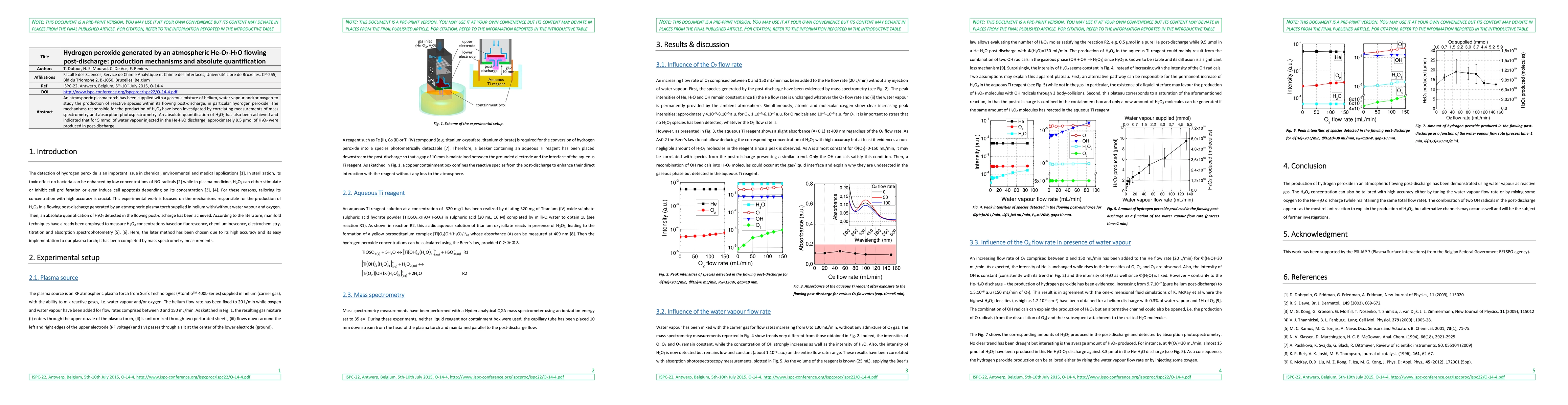 This study investigates the production mechanisms and absolute quantification of hydrogen peroxide in the flowing post-discharge of an atmospheric plasma torch supplied with helium, water vapor, and/or oxygen. The research correlates mass spectrometry and absorption photospectrometry measurements, revealing that approximately 9.5 mol of H2O2 are produced for every 5 mmol of water vapor injected.