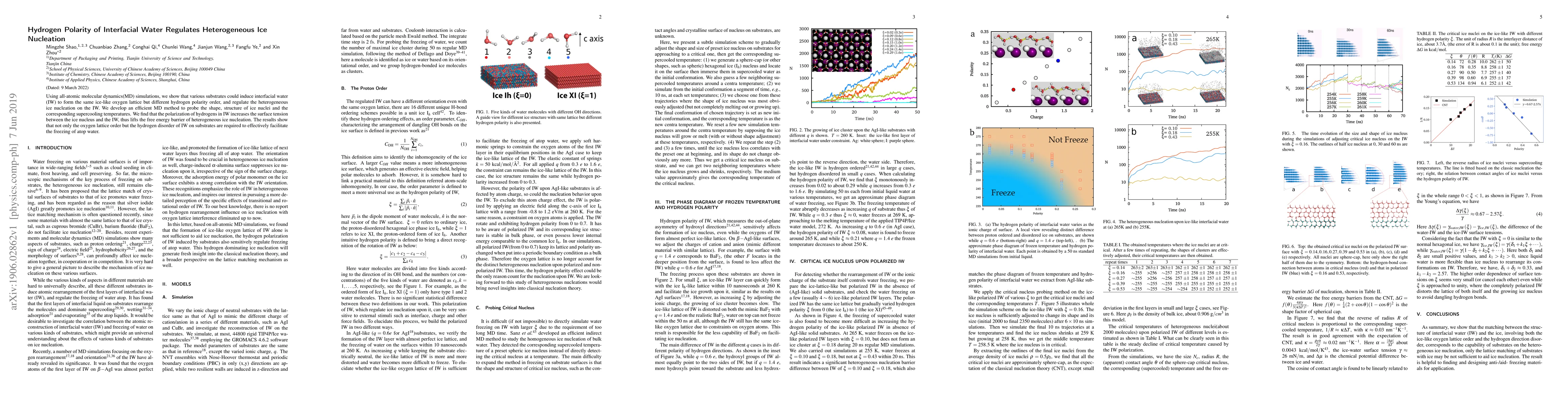 The study employs all-atomic molecular dynamics (MD) simulations to investigate the effect of interfacial water (IW) hydrogen polarity on heterogeneous ice nucleation. An efficient MD method is developed to probe the shape, structure of ice nuclei, and corresponding supercooling temperatures.