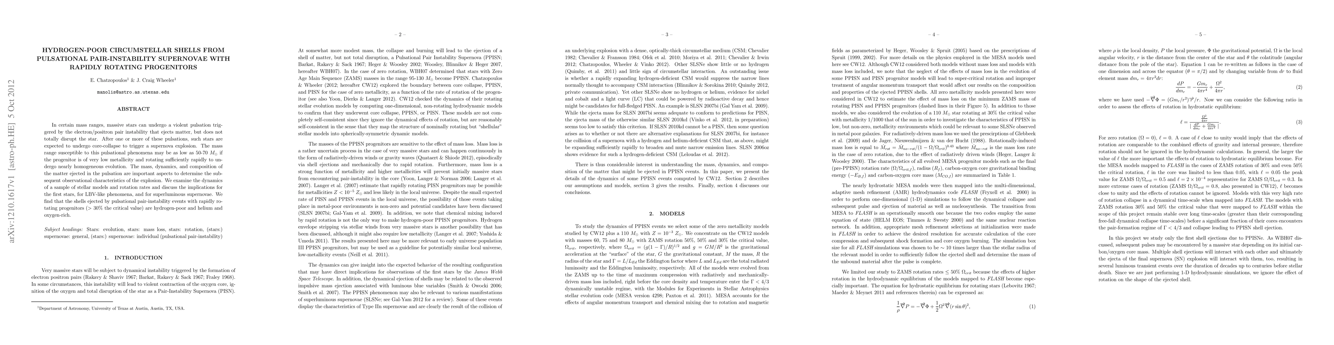 This paper investigates the dynamics of hydrogen-poor circumstellar shells ejected from pulsational pair-instability supernovae in massive, rapidly rotating stars. The findings suggest these shells are helium and oxygen-rich, with implications for first stars, luminous blue variables, and superluminous supernovae.