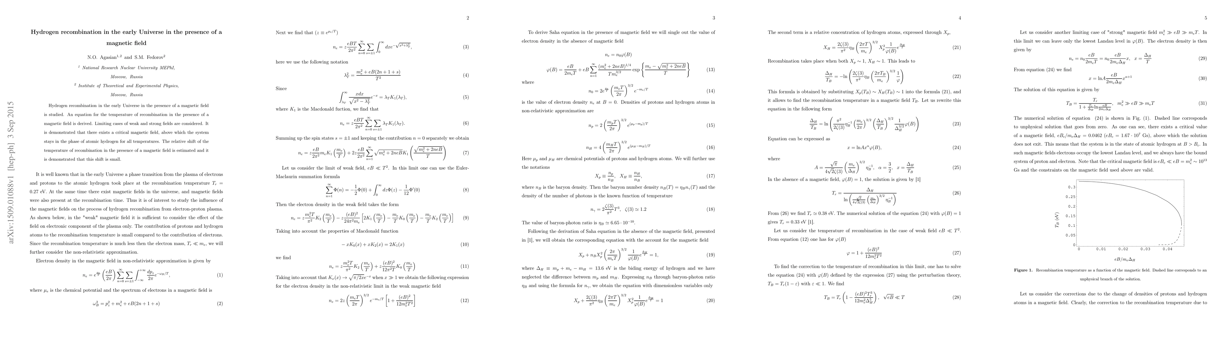 This study derives an equation for hydrogen recombination temperature in the early Universe with a magnetic field, showing a critical magnetic field that maintains atomic hydrogen phase across all temperatures. The relative shift in recombination temperature due to the magnetic field is found to be minimal.