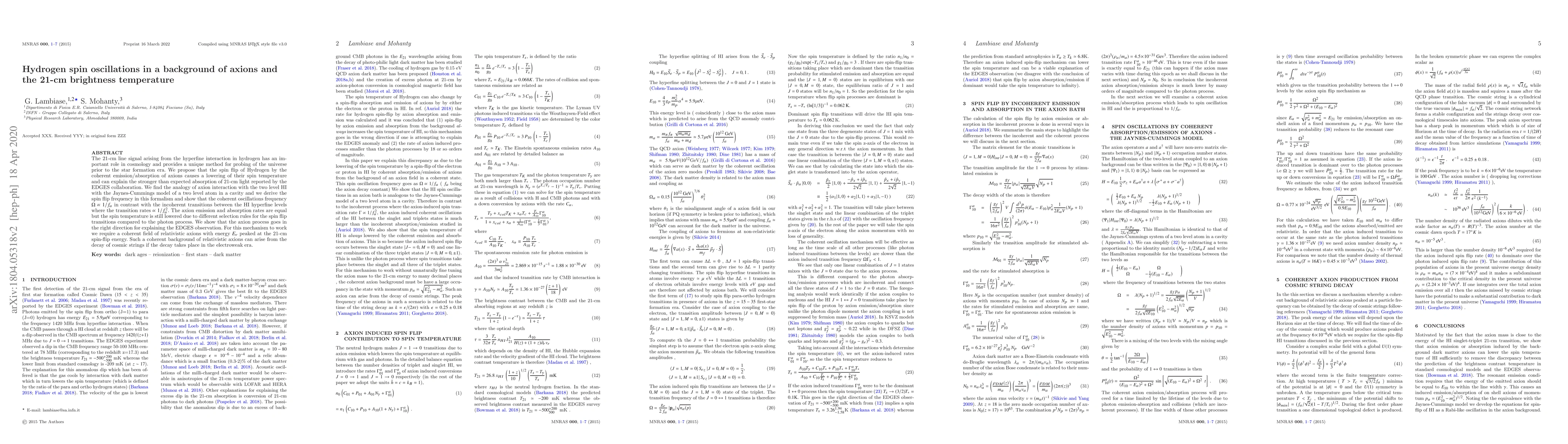 Axion interactions with hydrogen can explain the stronger-than-expected absorption of 21-cm light, requiring a coherent field of relativistic axions for this mechanism to work.