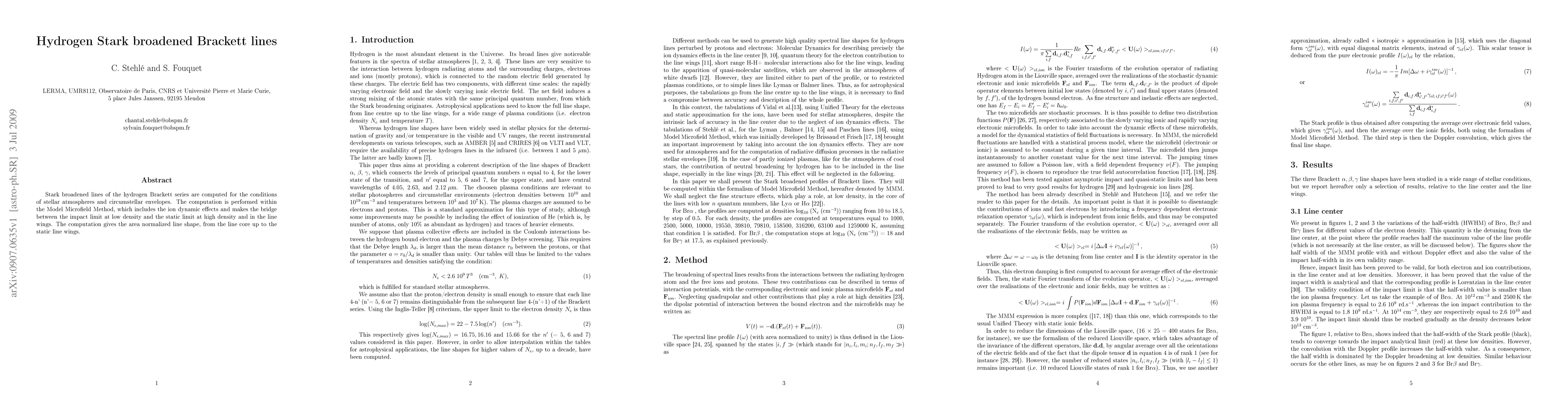 Stark broadened lines of the hydrogen Brackett series are computed for the conditions of stellar atmospheres and circumstellar envelopes. The computation is performed within the Model Microfield Method, which includes the ion dynamic effects and makes the bridge between the impact limit at low density and the static limit at high density and in the line wings. The computation gives the area normalized line shape, from the line core up to the static line wings.
