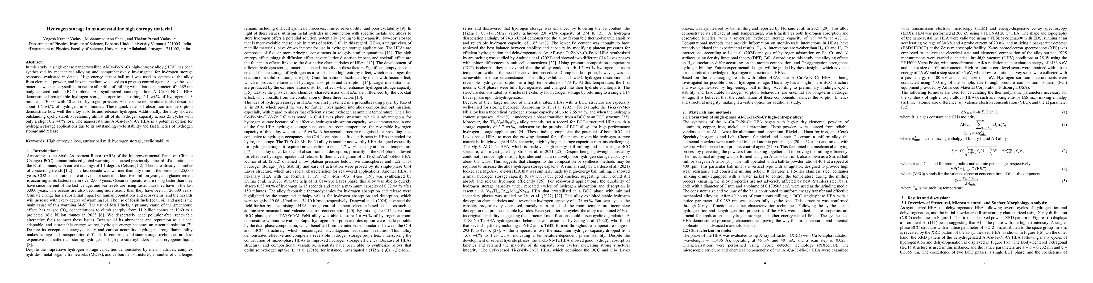 In this study, a single-phase nanocrystalline Al-Cu-Fe-Ni-Cr high-entropy alloy (HEA) has been synthesized by mechanical alloying and comprehensively investigated for hydrogen storage responses evaluated in details. High-energy attritor ball mill was used to synthesize the alloy from elemental powder, and hexane medium was used as a process control agent. As synthesized materials was nanocrystalline in nature after 40 h of milling with a lattice parameter of 0.289 nm body-centered cubic (BCC) phase. As synthesized nanocrystalline Al-Cu-Fe-Ni-Cr HEA demonstrated remarkable hydrogen storage properties, absorbing 2.1 wt.% of hydrogen in 3 minutes at 300{\deg}C with 50 atm of hydrogen pressure. At the same temperature, it also desorbed about 1.6 wt.% of hydrogen in 6 minutes. These quick rates of absorption and desorption demonstrate how well the alloy absorbs and releases hydrogen. Additionally, the alloy showed outstanding cyclic stability, retaining almost all of its hydrogen capacity across 25 cycles with only a slight 0.2 wt.% loss. The nanocrystalline Al-Cu-Fe-Ni-Cr HEA is a potential option for hydrogen storage applications due to its outstanding cycle stability and fast kinetics of hydrogen storage and release.
