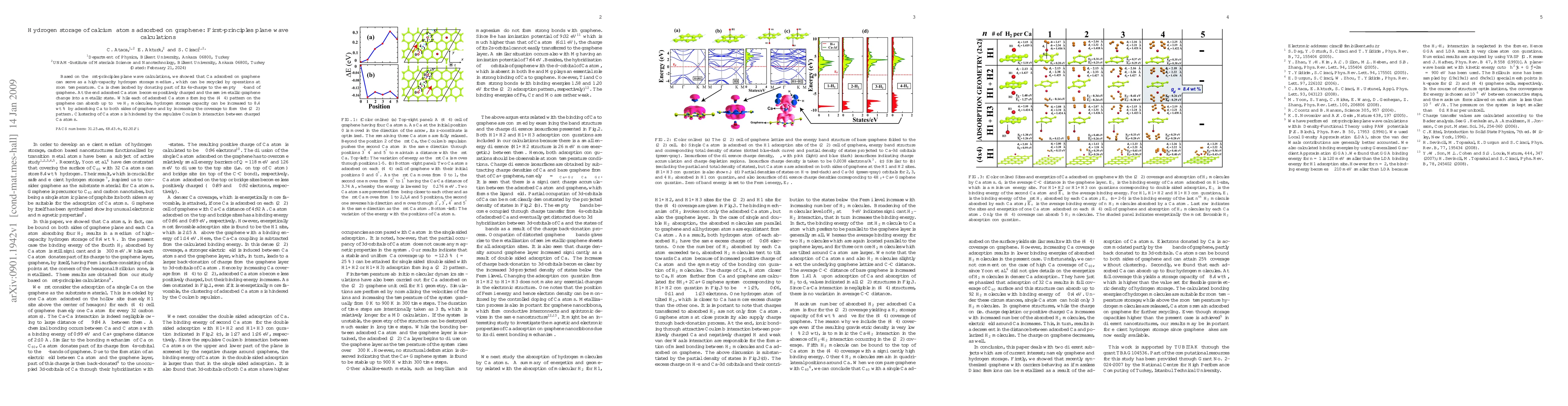 Summary: First-principles calculations reveal that calcium adsorbed on graphene can store hydrogen efficiently, with each Ca-graphene unit absorbing up to five H₂ molecules, achieving a high storage capacity of 8.4 wt %, and can be recycled at room temperature.