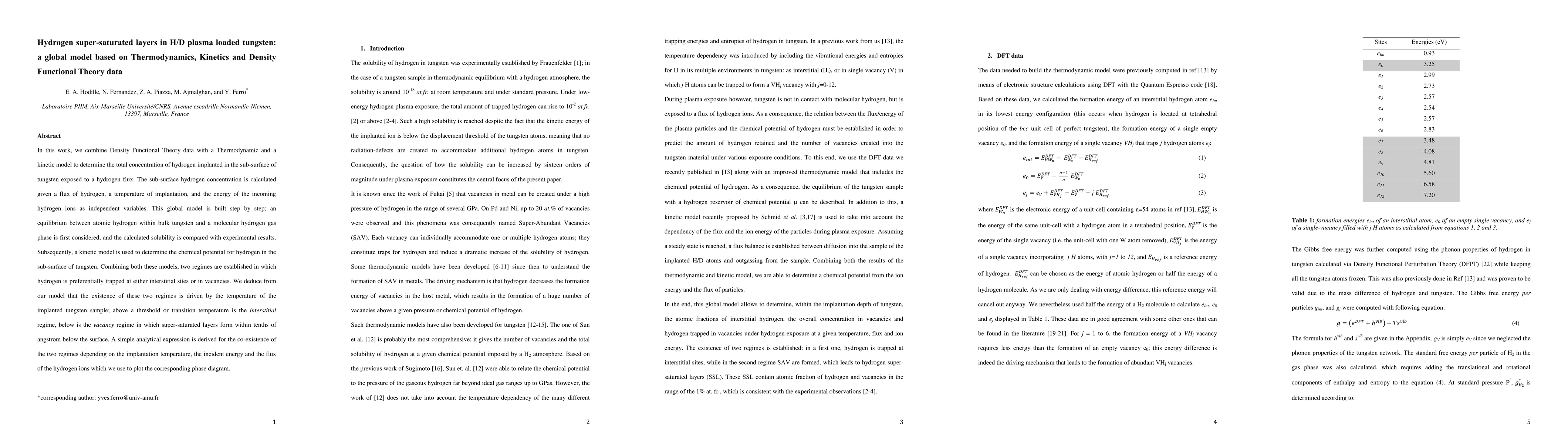 In this work, we combine Density Functional Theory data with a Thermodynamic and a kinetic model to determine the total concentration of hydrogen implanted in the sub-surface of tungsten exposed to a hydrogen flux. The sub-surface hydrogen concentration is calculated given a flux of hydrogen, a temperature of implantation, and the energy of the incoming hydrogen ions as independent variables. This global model is built step by step; an equilibrium between atomic hydrogen within bulk tungsten and a molecular hydrogen gas phase is first considered, and the calculated solubility is compared with experimental results. Subsequently, a kinetic model is used to determine the chemical potential for hydrogen in the sub-surface of tungsten. Combining both these models, two regimes are established in which hydrogen is preferentially trapped at either interstitial sites or in vacancies. We deduce from our model that the existence of these two regimes is driven by the temperature of the implanted tungsten sample; above a threshold or transition temperature is the interstitial regime, below is the vacancy regime in which super-saturated layers form within tenths of angstrom below the surface. A simple analytical expression is derived for the coexistence of the two regimes depending on the implantation temperature, the incident energy and the flux of the hydrogen ions which we use to plot the corresponding phase diagram.