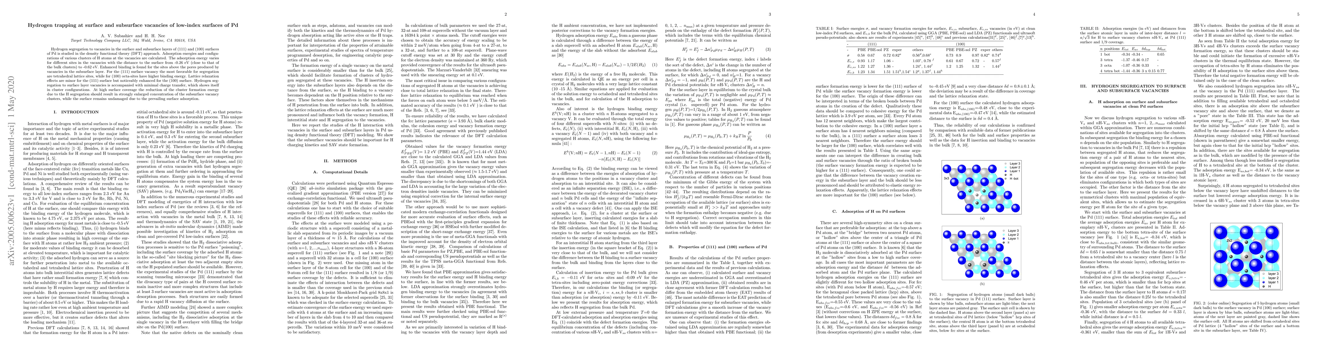 Hydrogen segregation to vacancies in the surface and subsurface layers of (111) and (100) surfaces of Pd is studied in the density functional theory (DFT) approach. Adsorption energies and configurations of various clusters of H atoms at the vacancies are calculated. The adsorption energy varies for different sites in the vacancies with the distance to the surface from -0.26 eV (close to that of the bulk clusters) to -0.62 eV. Enhanced binding is found for the sites above the pores produced by vacancies in the subsurface layer. For the (111) surface vacancy the most favorable for segregation are tetrahedral lattice sites, while for (100) octa-sites have higher binding energy. Lattice relaxation effects are minor for the (111) surface but noticeably enhanced for the (100) surface. Hydrogen segregation to surface layer vacancies is accompanied with minimal charge transfer, which shows itself in cluster configurations. At high surface coverage the reduction of the cluster formation energy due to the H segregation should result in strongly enlarged concentration of the subsurface vacancy clusters, while the surface remains undamaged due to the prevailing surface adsorption.