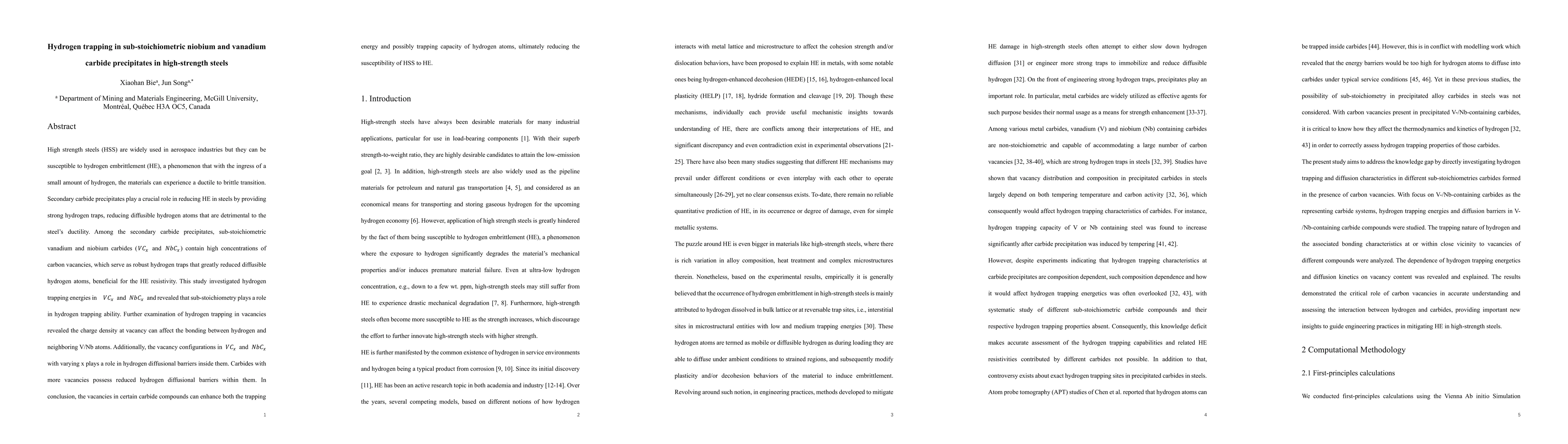 The research presents a detailed analysis of hydrogen trapping energies in sub-stoichiometric VCx and NbCx, highlighting the role of vacancies, charge density, and vacancy configurations in enhancing hydrogen trapping and diffusional barriers.