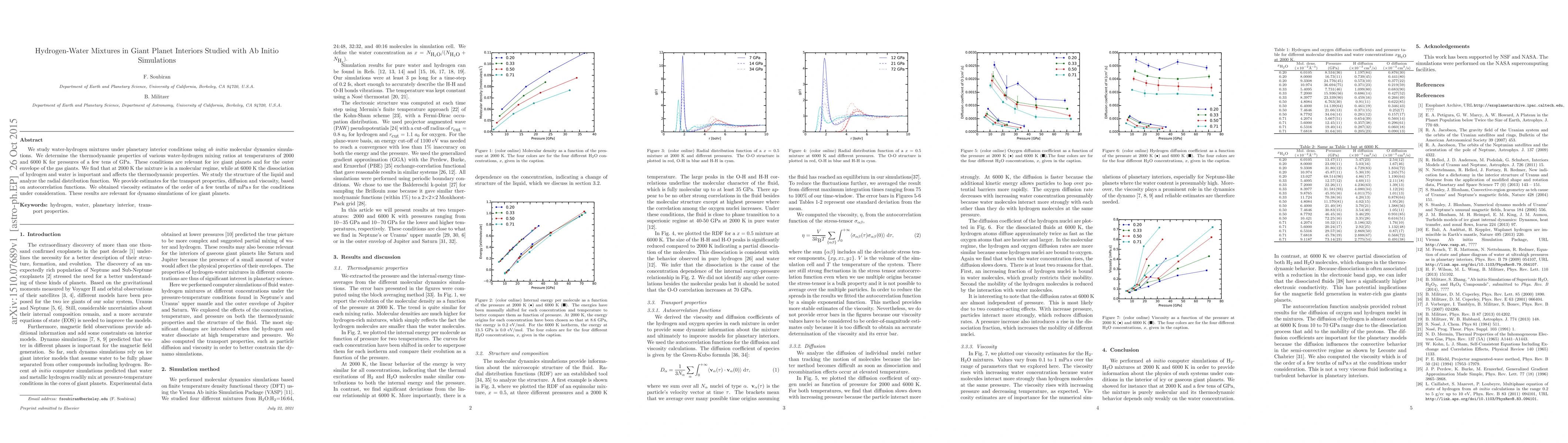 This paper uses ab initio molecular dynamics simulations to study hydrogen-water mixtures under the extreme conditions of giant planet interiors, finding that at 2000 K the mixture remains molecular, while at 6000 K dissociation occurs, affecting thermodynamic properties. The study provides viscosity estimates useful for dynamo simulations of ice giant planets.