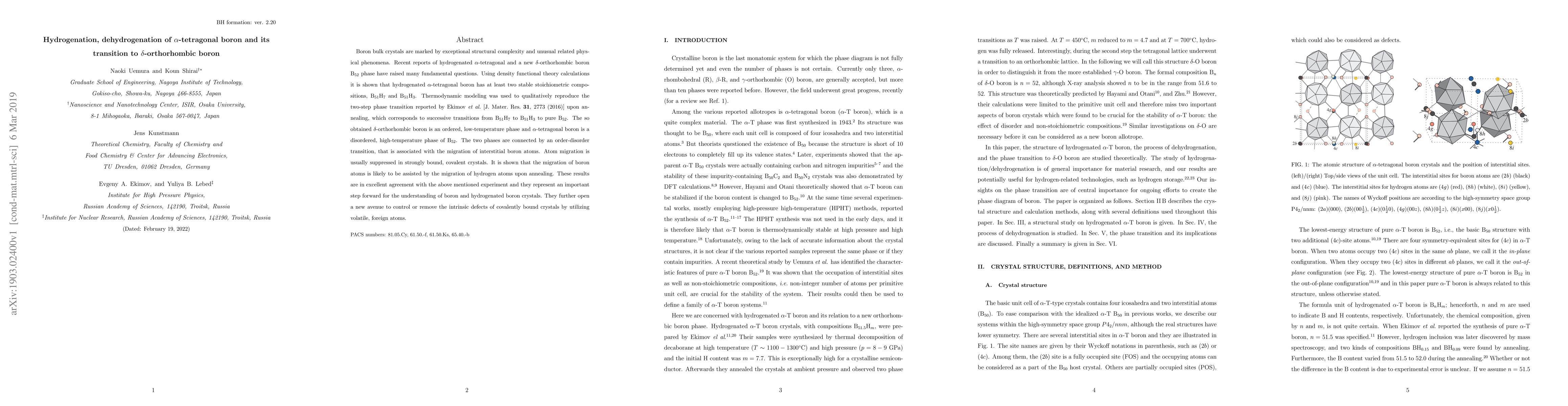 Boron bulk crystals are marked by exceptional structural complexity and unusual related physical phenomena. Recent reports of hydrogenated $\alpha$-tetragonal and a new $\delta$-orthorhombic boron B$_{52}$ phase have raised many fundamental questions. Using density functional theory calculations it is shown that hydrogenated $\alpha$-tetragonal boron has at least two stable stoichiometric compositions, B$_{51}$H$_{7}$ and B$_{51}$H$_{3}$. Thermodynamic modeling was used to qualitatively reproduce the two-step phase transition reported by Ekimov et al. [J. Mater. Res. 31, 2773 (2016)] upon annealing, which corresponds to successive transitions from B$_{51}$H$_{7}$ to B$_{51}$H$_{3}$ to pure B$_{52}$. The so obtained $\delta$-orthorhombic boron is an ordered, low-temperature phase and $\alpha$-tetragonal boron is a disordered, high-temperature phase of B$_{52}$. The two phases are connected by an order-disorder transition, that is associated with the migration of interstitial boron atoms. Atom migration is usually suppressed in strongly bound, covalent crystals. It is shown that the migration of boron atoms is likely to be assisted by the migration of hydrogen atoms upon annealing. These results are in excellent agreement with the above mentioned experiment and they represent an important step forward for the understanding of boron and hydrogenated boron crystals. They further open a new avenue to control or remove the intrinsic defects of covalently bound crystals by utilizing volatile, foreign atoms.