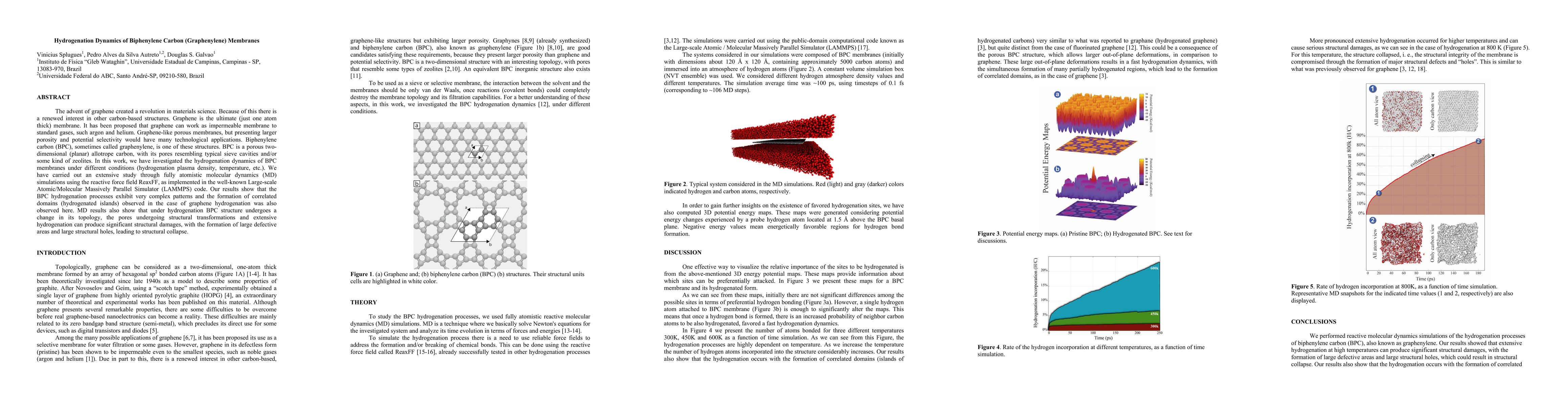 Researchers studied hydrogenation dynamics of biphenylene carbon (graphenylene) membranes using molecular dynamics simulations, finding complex patterns and correlated domain formation, which can lead to structural collapse under extensive hydrogenation.