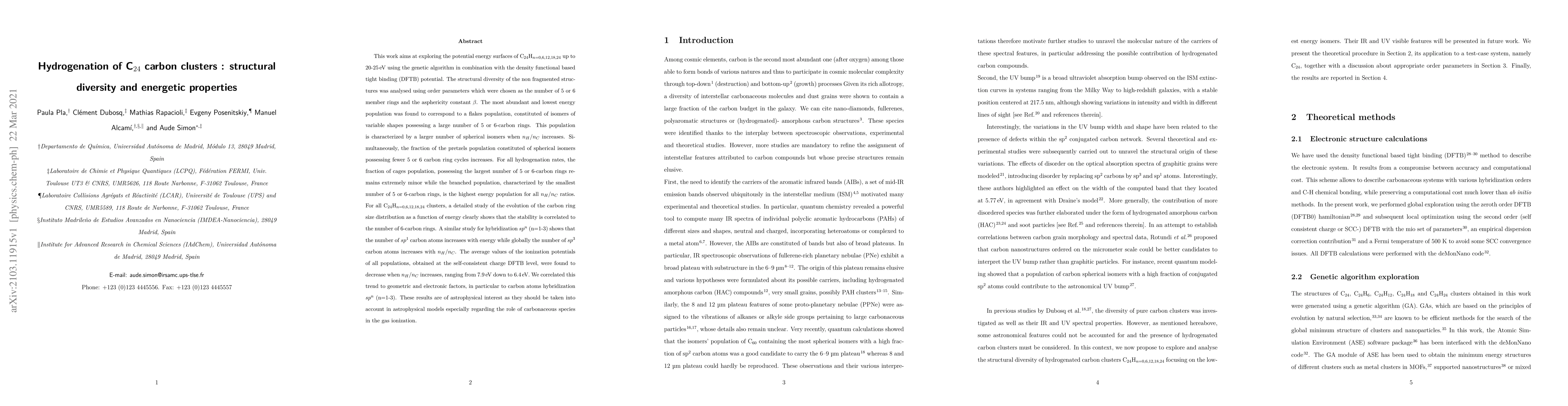 This work aims at exploring the potential energy surfaces of C$_{24}$H$_n${n=0,6,12,18,24} up to 20-25\,eV using the genetic algorithm in combination with the density functional based tight binding (DFTB) potential. The structural diversity of the non fragmented structures was analysed using order parameters which were chosen as the number of 5 or 6 carbon rings and the asphericity constant $\beta$. The most abundant and lowest energy population was found to correspond to a flakes population, constituted of isomers of variable shapes possessing a large number of 5 or 6-carbon rings. This population is characterized by a larger number of spherical isomers when $n_H/n_C$ increases. Simultaneously, the fraction of the pretzels population constituted of spherical isomers possessing fewer 5 or 6 carbon ring cycles increases. For all hydrogenation rates, the fraction of cages population remains extremely minor while the branched population is the highest energy population for all $n_H/n_C$ ratios. For all C$_{24}$H$_n${n=0,6,12,18,24} clusters, a detailed study of the evolution of the carbon ring size distribution as a function of energy clearly shows that the stability is correlated to the number of 6-carbon rings. A similar study for hybridization $sp^n$ (n=1-3) shows that the number of $sp^1$ carbon atoms increases with energy while globally the number of $sp^3$ carbon atoms increases with $n_H/n_C$. The average values of the ionization potentials of all populations were found to decrease when $n_H/n_C$ increases, ranging from 7.9\,eV down to 6.4\,eV that we correlated to carbon atoms hybridization $sp^n$ (n=1-3). These results are of astrophysical interest as they should be taken into account in astrophysical models especially regarding the role of carbonaceous species in the gas ionization.