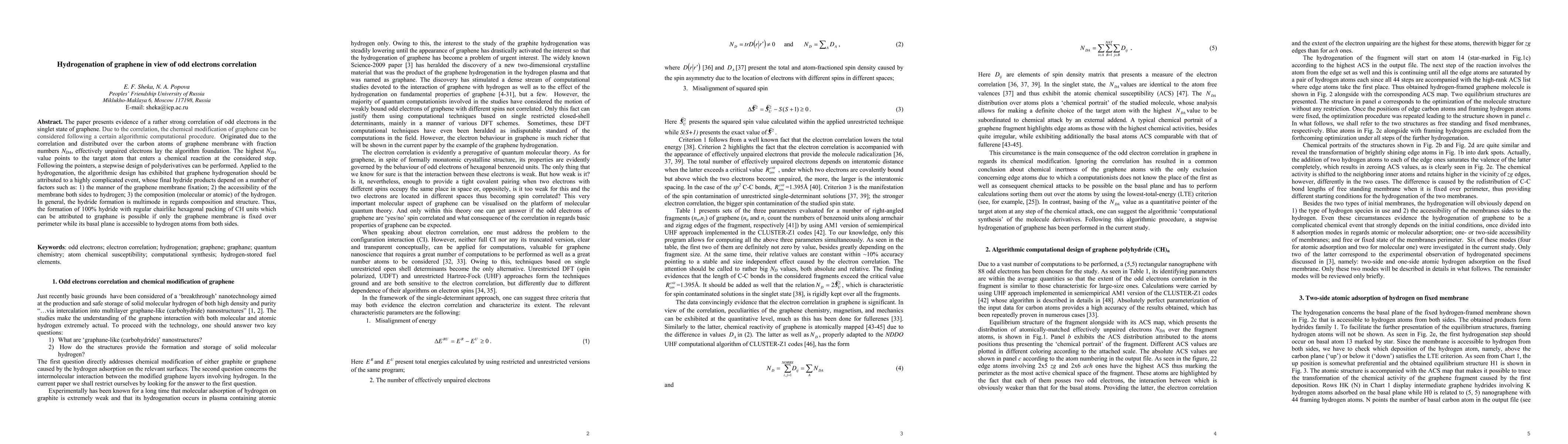 This paper reveals a strong correlation of odd electrons in graphene's singlet state, leading to a computational algorithm for its chemical modification. The study shows that hydrogenation of graphene is a complex process influenced by factors such as graphene fixation, hydrogen accessibility, and hydrogen composition, potentially resulting in diverse hydride structures, including graphane.