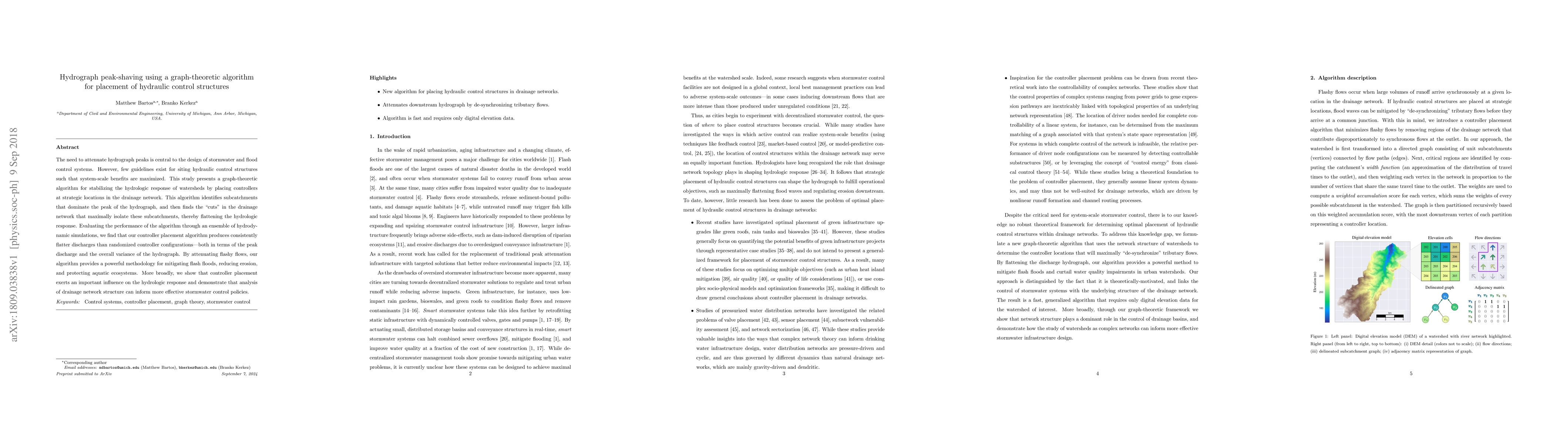 Researchers developed a graph-theoretic algorithm to optimize stormwater control system design, finding that strategically placing hydraulic control structures can effectively flatten hydrograph peaks and reduce flash floods.