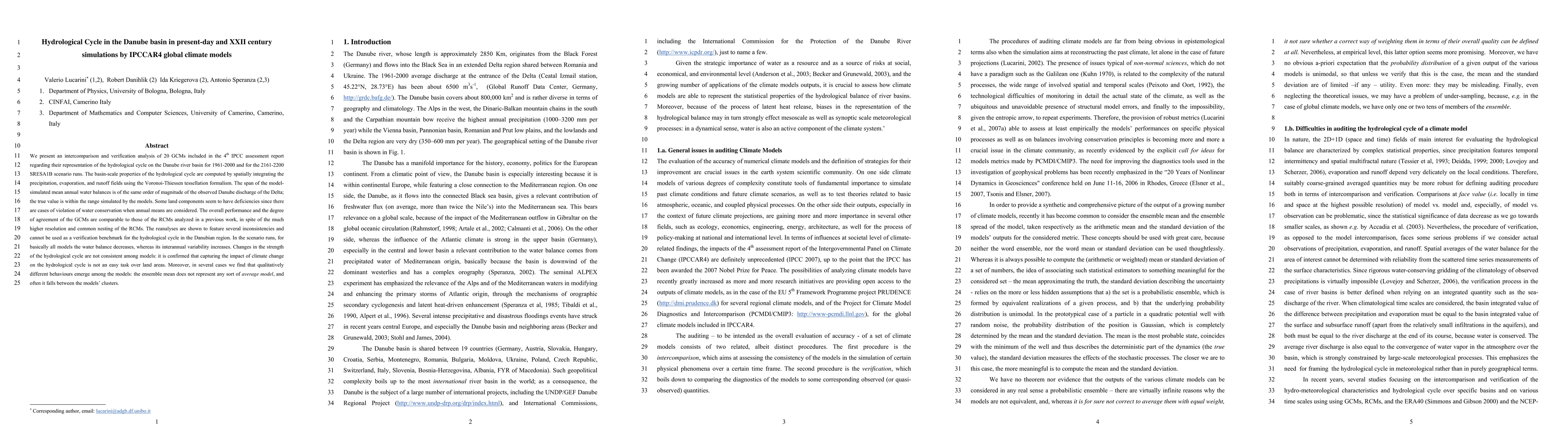 This paper evaluates 20 global climate models from the IPCCAR4 report for their simulation of the hydrological cycle in the Danube basin from 1961-2000 and under the SRESA1B scenario for 2161-2200. It finds that while models show comparable performance to regional models, they exhibit inconsistencies and do not uniformly predict changes in the hydrological cycle, highlighting challenges in climate change impact assessments.