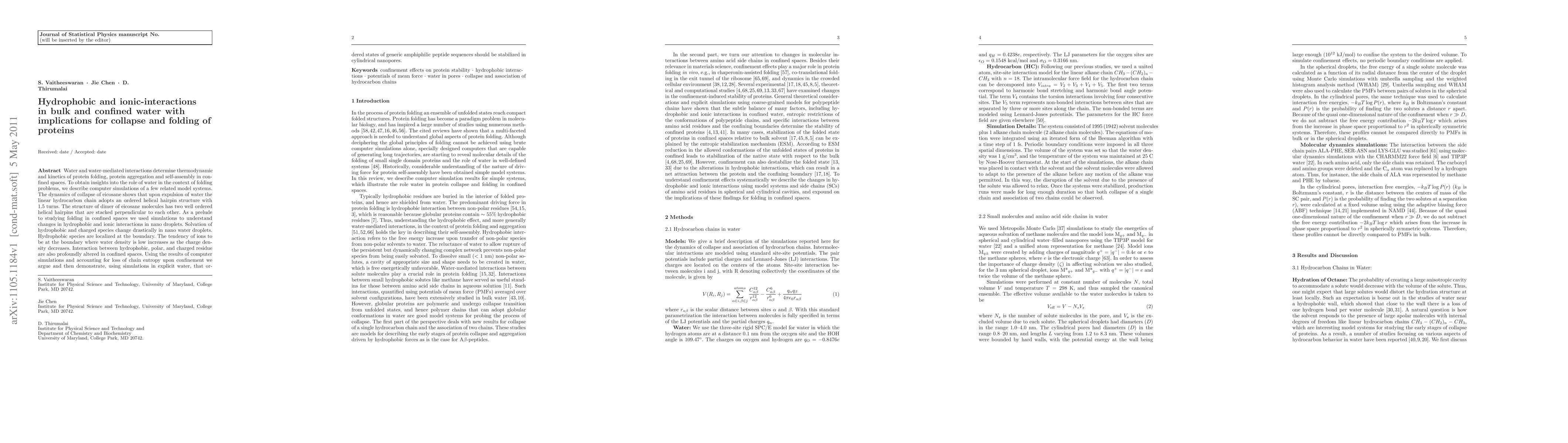 This paper investigates the impact of hydrophobic and ionic interactions in bulk and confined water on protein folding and collapse, revealing that confined spaces significantly alter these interactions, stabilizing ordered helical structures in nanopores and influencing the thermodynamics of protein folding.