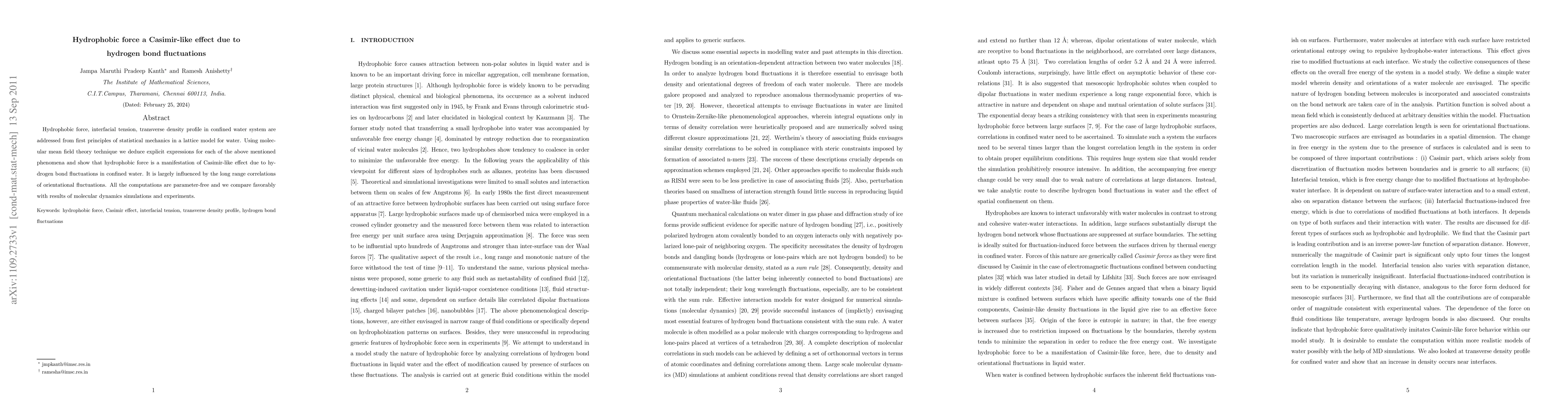 Hydrophobic force, interfacial tension, transverse density profile in confined water system are addressed from first principles of statistical mechanics in a lattice model for water. Using molecular mean field theory technique we deduce explicit expressions for each of the above mentioned phenomena and show that hydrophobic force is a manifestation of Casimir-like effect due to hydrogen bond fluctuations in confined water. It is largely influenced by the long range correlations of orientational fluctuations. All the computations are parameter-free and we compare favorably with results of molecular dynamics simulations and experiments.