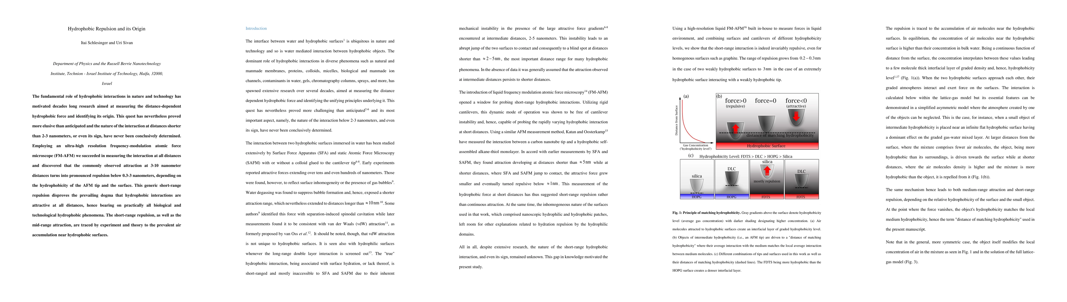 This study reveals that hydrophobic interactions exhibit a repulsive force at short distances (below 0.3-3 nanometers) using ultra-high resolution AFM, contradicting the long-held belief of attraction at all distances. The short-range repulsion and mid-range attraction are attributed to air accumulation near hydrophobic surfaces.