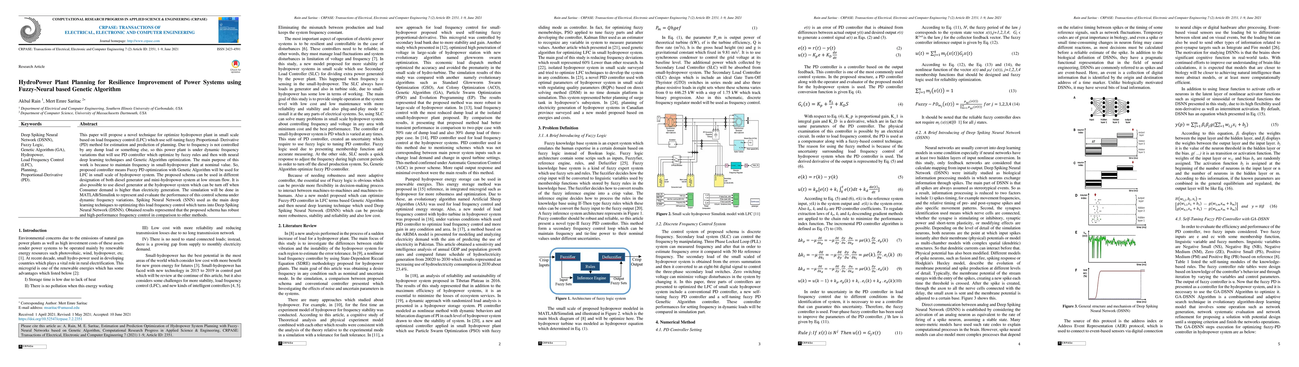 This paper will propose a novel technique for optimize hydropower plant in small scale based on load frequency control (LFC) which use self-tuning fuzzy Proportional- Derivative (PD) method for estimation and prediction of planning. Due to frequency is not controlled by any dump load or something else, so this power plant is under dynamic frequency variations that will use PD controller which optimize by fuzzy rules and then with neural deep learning techniques and Genetic Algorithm optimization. The main purpose of this work is because to maintain frequency in small-hydropower plant at nominal value. So, proposed controller means Fuzzy PD optimization with Genetic Algorithm will be used for LFC in small scale of hydropower system. The proposed schema can be used in different designation of both diesel generator and mini-hydropower system at low stream flow. It is also possible to use diesel generator at the hydropower system which can be turn off when Consumer demand is higher than electricity generation. The simulation will be done in MATLAB/Simulink to represent and evaluate the performance of this control schema under dynamic frequency variations. Spiking Neural Network (SNN) used as the main deep learning techniques to optimizing this load frequency control which turns into Deep Spiking Neural Network (DSNN). Obtained results represented that the proposed schema has robust and high-performance frequency control in comparison to other methods.