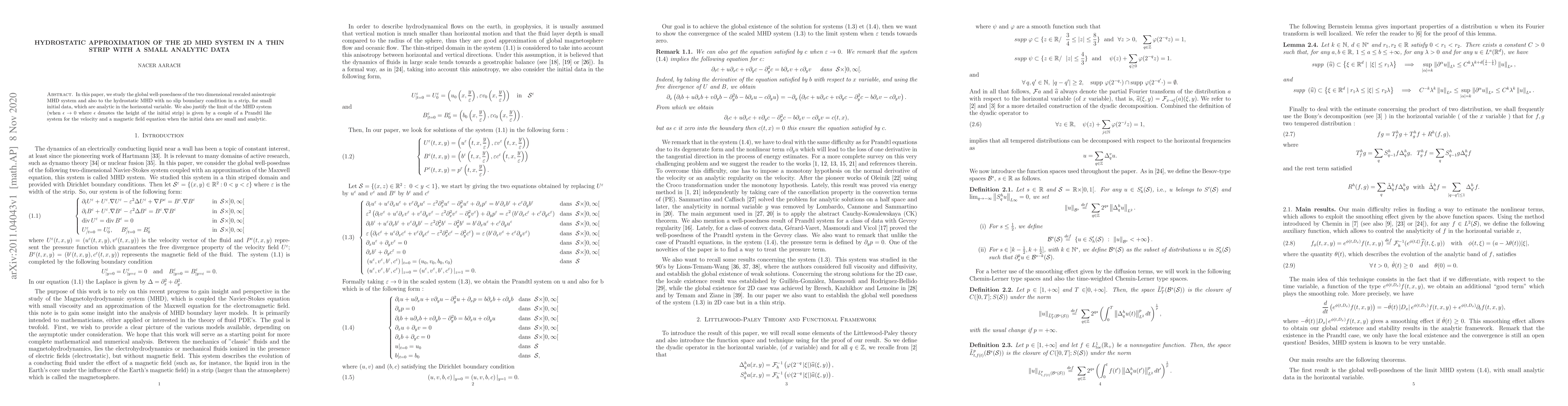 Researchers studied the behavior of a 2D magnetic fluid dynamics system in a thin strip with small initial data, finding that it converges to Prandtl-like equations for velocity and a magnetic field equation as the strip's width approaches zero.