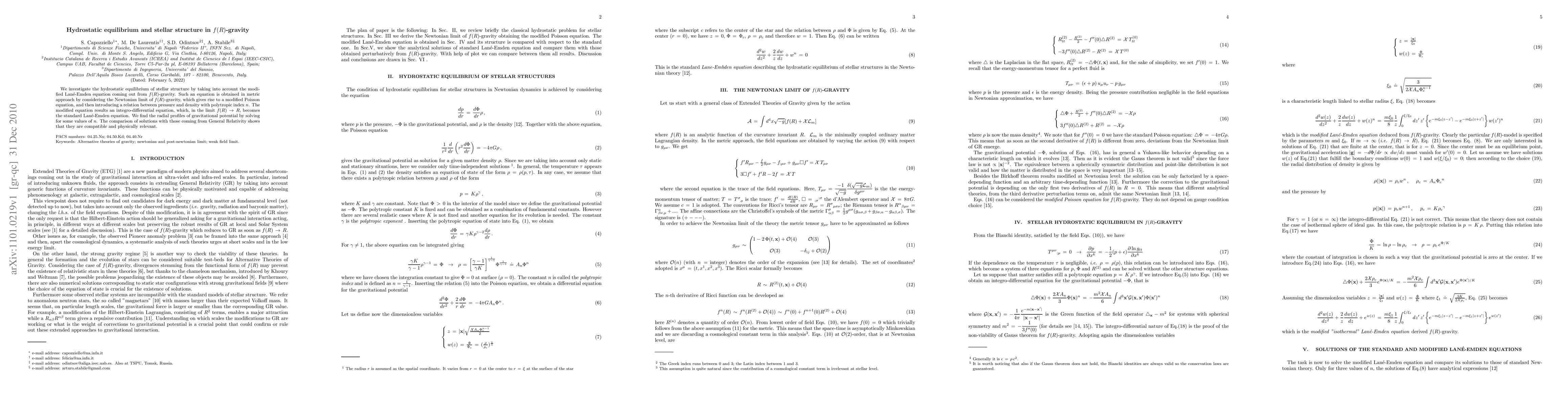We investigate the hydrostatic equilibrium of stellar structure by taking into account the modi- fied La\'e-Emden equation coming out from f(R)-gravity. Such an equation is obtained in metric approach by considering the Newtonian limit of f(R)-gravity, which gives rise to a modified Poisson equation, and then introducing a relation between pressure and density with polytropic index n. The modified equation results an integro-differential equation, which, in the limit f(R) \rightarrow R, becomes the standard La\'e-Emden equation. We find the radial profiles of gravitational potential by solving for some values of n. The comparison of solutions with those coming from General Relativity shows that they are compatible and physically relevant.