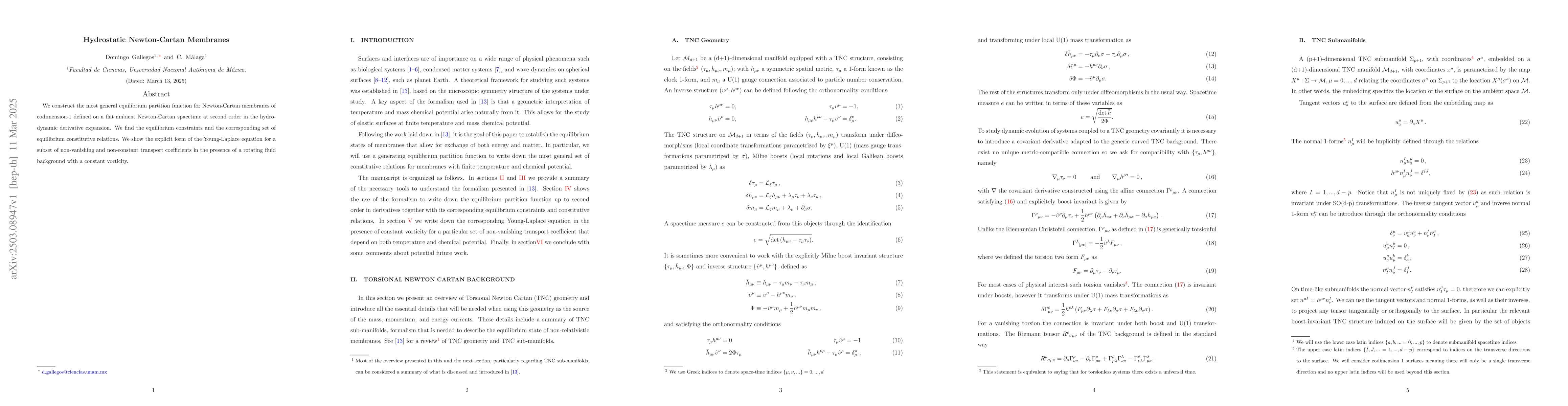 This paper constructs the most general equilibrium partition function for Newton-Cartan membranes, identifying equilibrium constraints and constitutive relations. It also derives the explicit Young-Laplace equation for rotating fluids with constant vorticity.