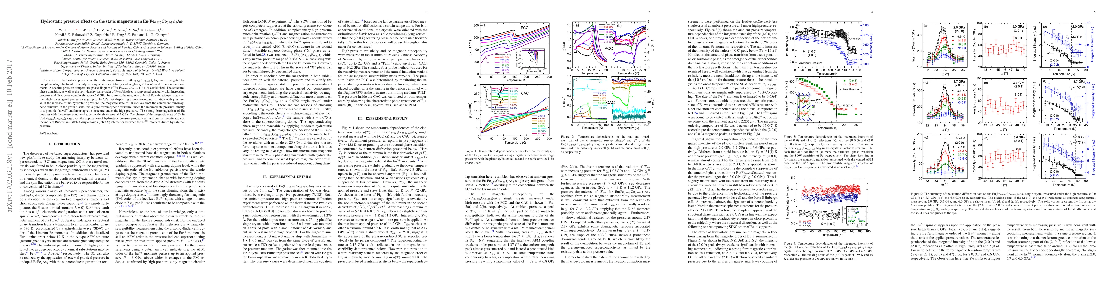 Hydrostatic pressure suppresses the magnetic order of Fe sublattice but preserves that of Eu sublattice, leading to a change in magnetic state from canted antiferromagnetic to ferromagnetic and finally to an antiferromagnetic structure.