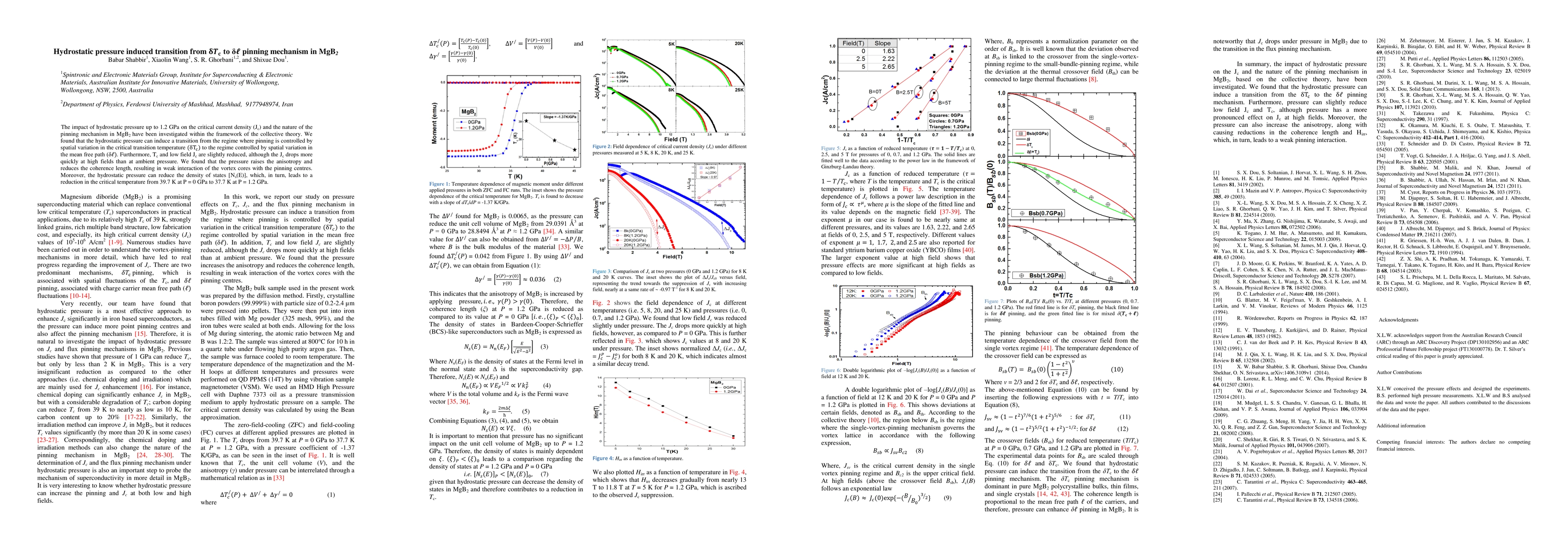 The impact of hydrostatic pressure up to 1.2 GPa on the critical current density (Jc) and the nature of the pinning mechanism in MgB2 have been investigated within the framework of the collective theory. We found that the hydrostatic pressure can induce a transition from the regime where pinning is controlled by spatial variation in the critical transition temperature ({\delta}T_c) to the regime controlled by spatial variation in the mean free path ({\delta}l). Furthermore, Tc and low field Jc are slightly reduced, although the Jc drops more quickly at high fields than at ambient pressure. We found that the pressure raises the anisotropy and reduces the coherence length, resulting in weak interaction of the vortex cores with the pinning centres. Moreover, the hydrostatic pressure can reduce the density of states [Ns(E)], which, in turn, leads to a reduction in the critical temperature from 39.7 K at P = 0 GPa to 37.7 K at P = 1.2 GPa.