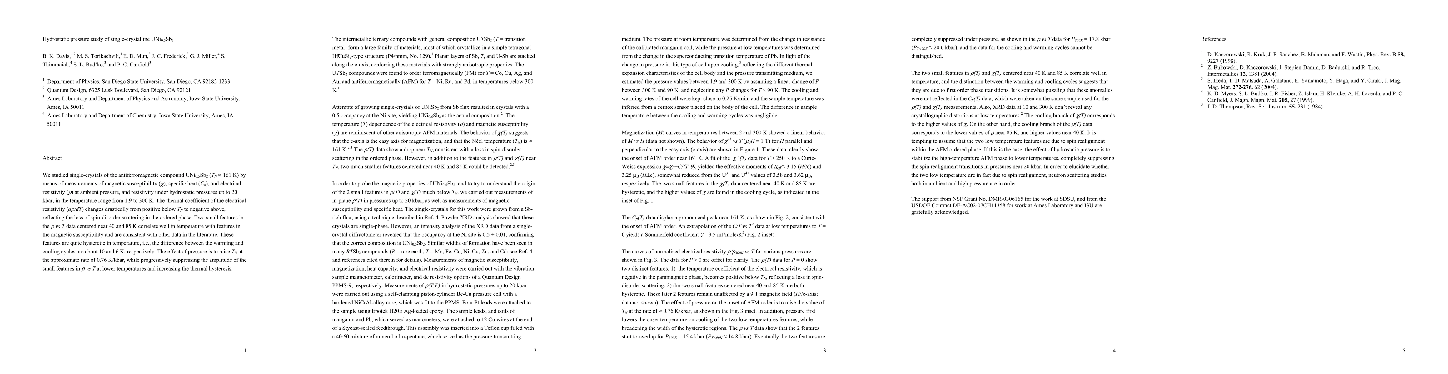We studied single-crystals of the antiferromagnetic compound UNi0.5Sb2 (TN ~ 161 K) by means of measurements of magnetic susceptibility (chi), specific heat (Cp), and electrical resistivity (rho) at ambient pressure, and resistivity under hydrostatic pressures up to 20 kbar, in the temperature range from 1.9 to 300 K. The thermal coefficient of the electrical resistivity (drho/dT) changes drastically from positive below TN to negative above, reflecting the loss of spin-disorder scattering in the ordered phase. Two small features in the rho vs T data centered near 40 and 85 K correlate well in temperature with features in the magnetic susceptibility and are consistent with other data in the literature. These features are quite hysteretic in temperature, i.e., the difference between the warming and cooling cycles are about 10 and 6 K, respectively. The effect of pressure is to raise TN at the approximate rate of 0.76 K/kbar, while progressively suppressing the amplitude of the small features in rho vs T at lower temperatures and increasing the thermal hysteresis.