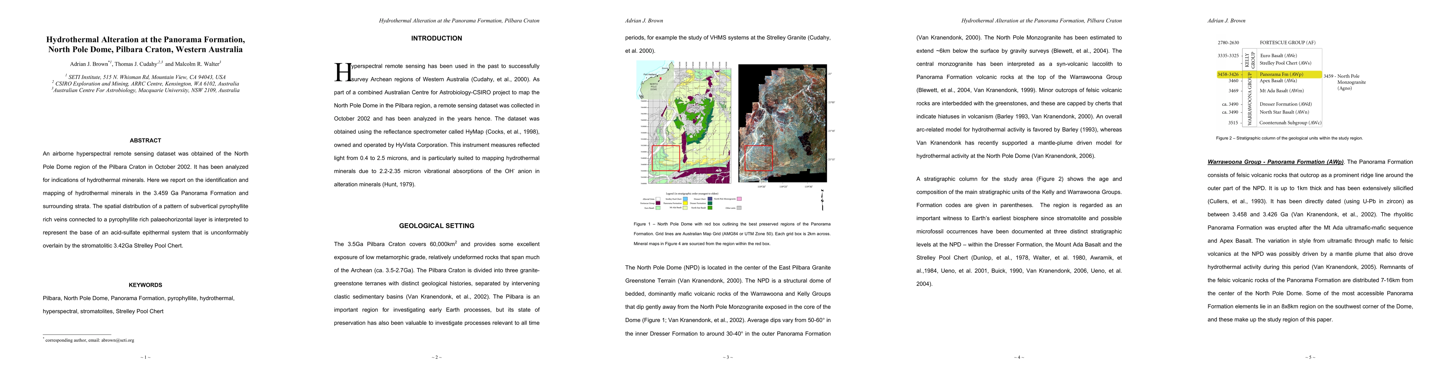 This study uses airborne hyperspectral remote sensing to identify and map hydrothermal minerals, specifically pyrophyllite, in the 3.459 Ga Panorama Formation and surrounding strata at North Pole Dome, Pilbara Craton, Western Australia. The findings suggest the presence of an ancient acid-sulfate epithermal system, unconformably overlain by the 3.42 Ga Strelley Pool Chert.