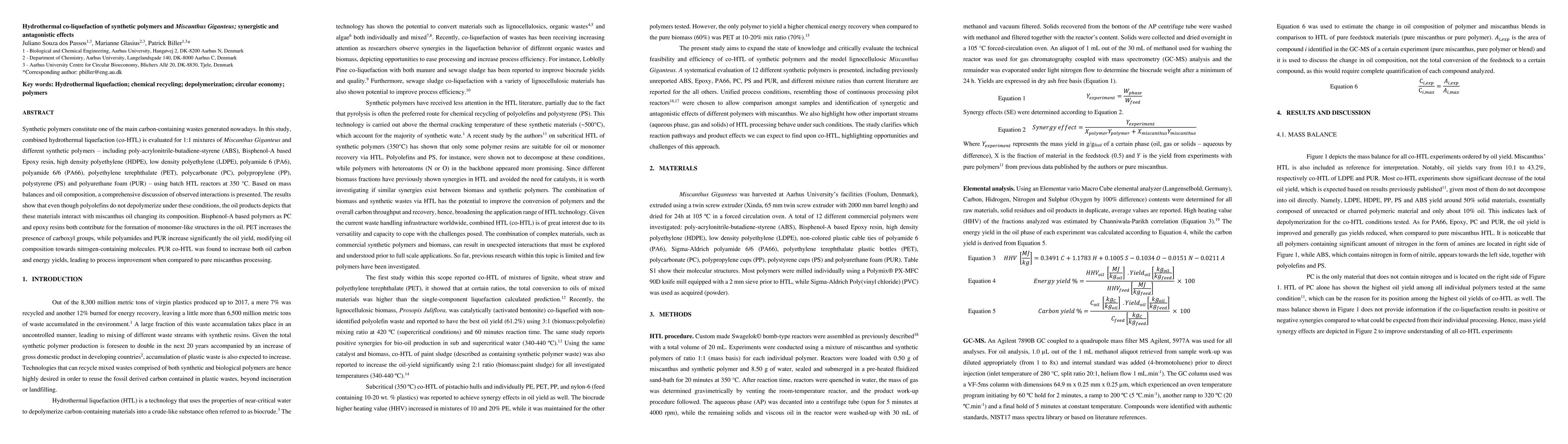 This study evaluates the hydrothermal co-liquefaction of Miscanthus Giganteus with various synthetic polymers, revealing synergistic interactions that alter oil composition and yield. Notably, polyurethane foam (PUR) significantly enhances both oil carbon and energy yields, improving the process compared to miscanthus alone.