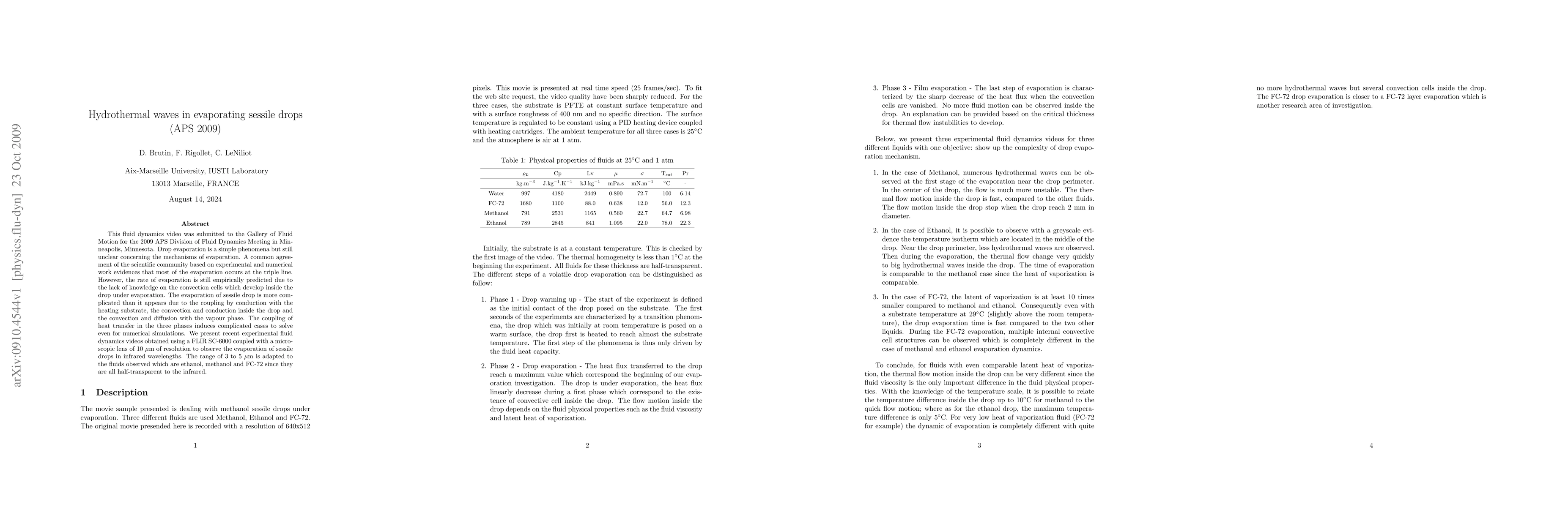 This study investigates the complex mechanisms of evaporation in sessile drops using high-resolution infrared video microscopy, revealing the intricate hydrothermal waves and convection cells that drive evaporation primarily at the triple line. The findings enhance understanding of the coupling between heat transfer in liquid, vapor, and substrate phases during drop evaporation.
